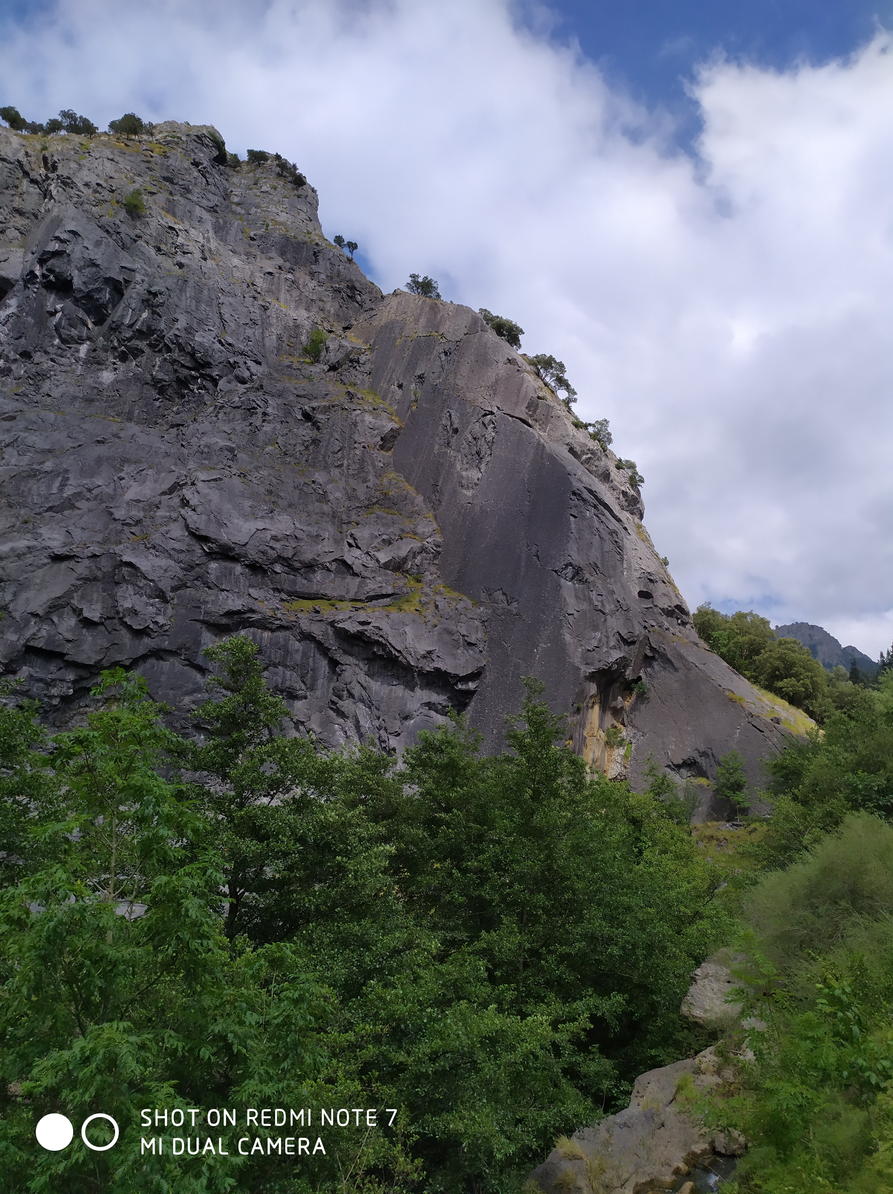 L1 : 5a, 40m, 9 points. Départ sous le surplomb large, juste à gauche d’un arbre à 5 mètres de haut. On remonte une dalle et on passe le surplomb juste à droite d’un dièdre par un mur raide.