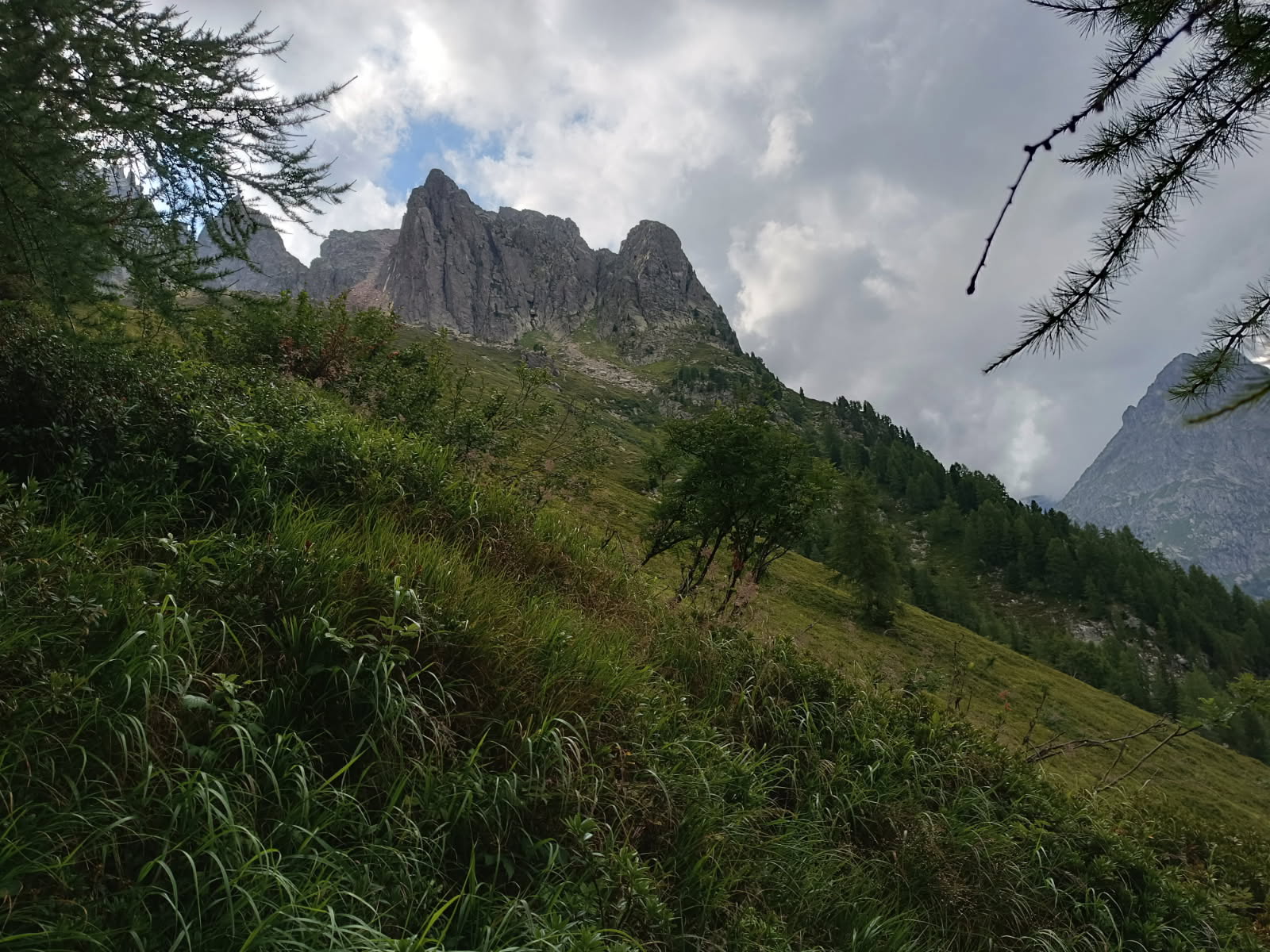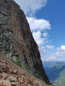 L3 : 5b; Contourner le surplomb au dessus me relais par la droite pour ensuite revenir à gauche et remonter un court mur à gauche du couloir herbeux raide jusqu’à un relais sur deux pitons et un goujon dans un dièdre. 2 pitons, 20 mètres.