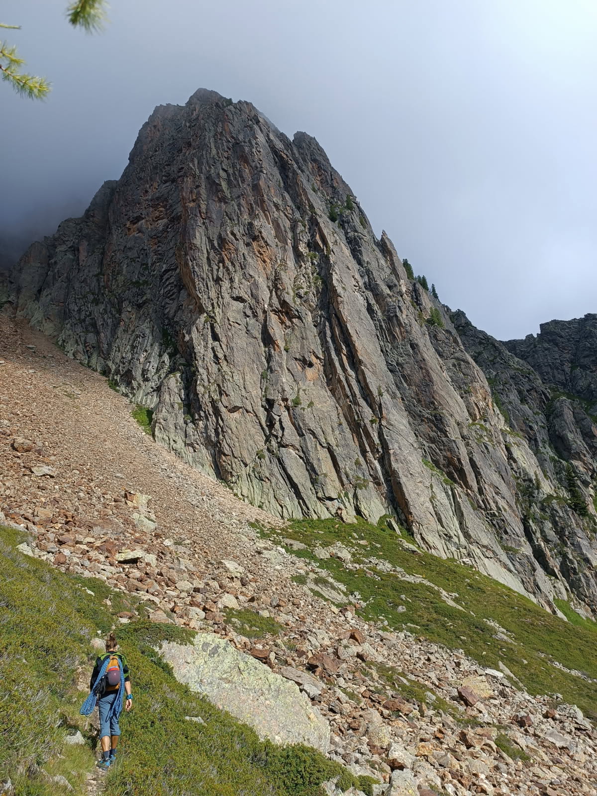 Mais pour les grimpeurs et alpinistes, c’est bien ce contrefort qui est intéressant. De nombreuses voies, parfois oubliées ou difficiles à retrouver (les topos Piola les dénigrent) parcourent ce superbe versant. On trouve des voies modernes ou rééquipées (dont une d’Andy Parkins, dib-dibdob-dob que j’aimerais faire !), des voies plus anciennes et des voies historiques, comme la nôtre : la voie Parat – Seigneur est une très grande classique du massif !