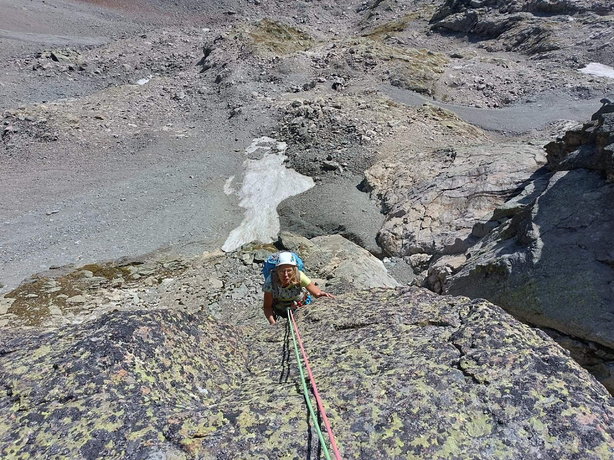 On trouve en revanche facilement le départ de la seconde partie (toujours grâce au topo Piola), en comprenant pourquoi ce fut parfois difficile pour des prédécesseurs : on ne voit aucun point. Ayant prévu de sortir au sommet et n’ayant pas d’informations sur l’arête sommitale, j’ai quelques friends et coinceurs donc je grimpe la ligne pour effectivement retrouver de l’équipement dans le haut. Une longueur de plus constitue le passage le plus intéressant de la voie, pour arriver sur une dernière longueur aboutissant à l’arête.