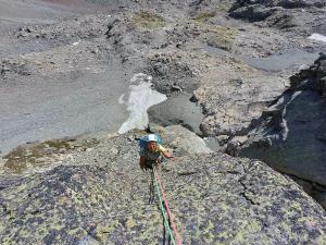 Après avoir eu un peu de mal à trouver le départ (le topo camptocamp confondait la droite et la gauche, ce qui n’est vraiment pas très pratique – le topo Piola est portant des plus clairs !), on enchaine rapidement une première partie qui est la section clé. Le premier 4a est fort dur pour la cotation, puis cela va mieux jusqu’au 6a. Celui-ci n’est pas très bien équipé car se grimpe un peu plus à gauche, et cela aurait été plus intéressant de passer encore plus à gauche pour créer une voie plus homogène – mais on ne voit ce détail que d’en haut.