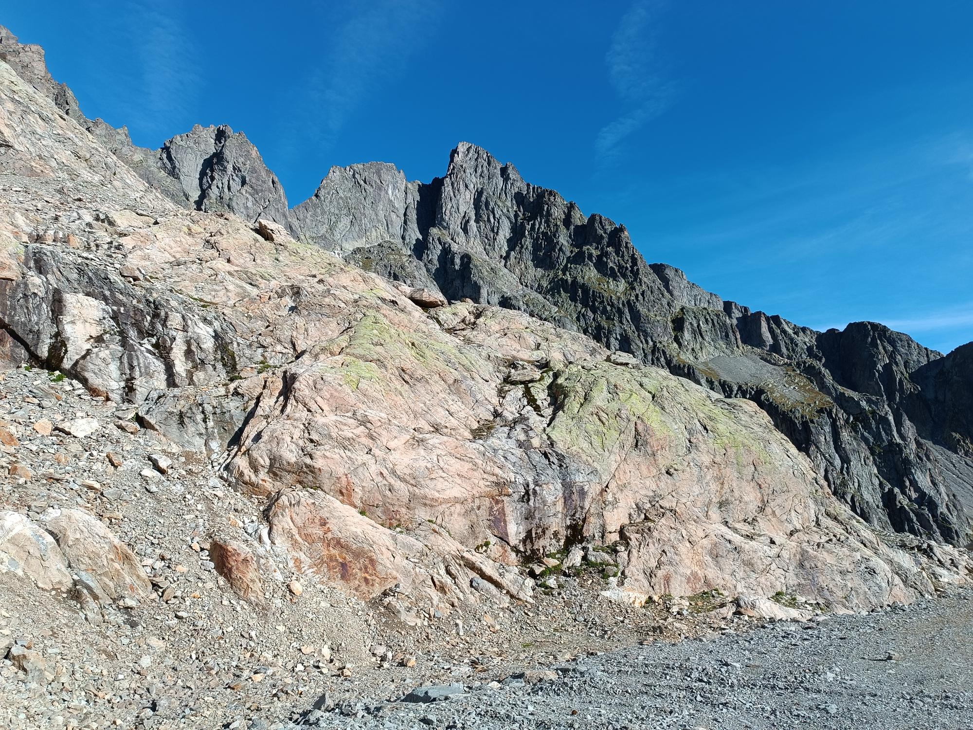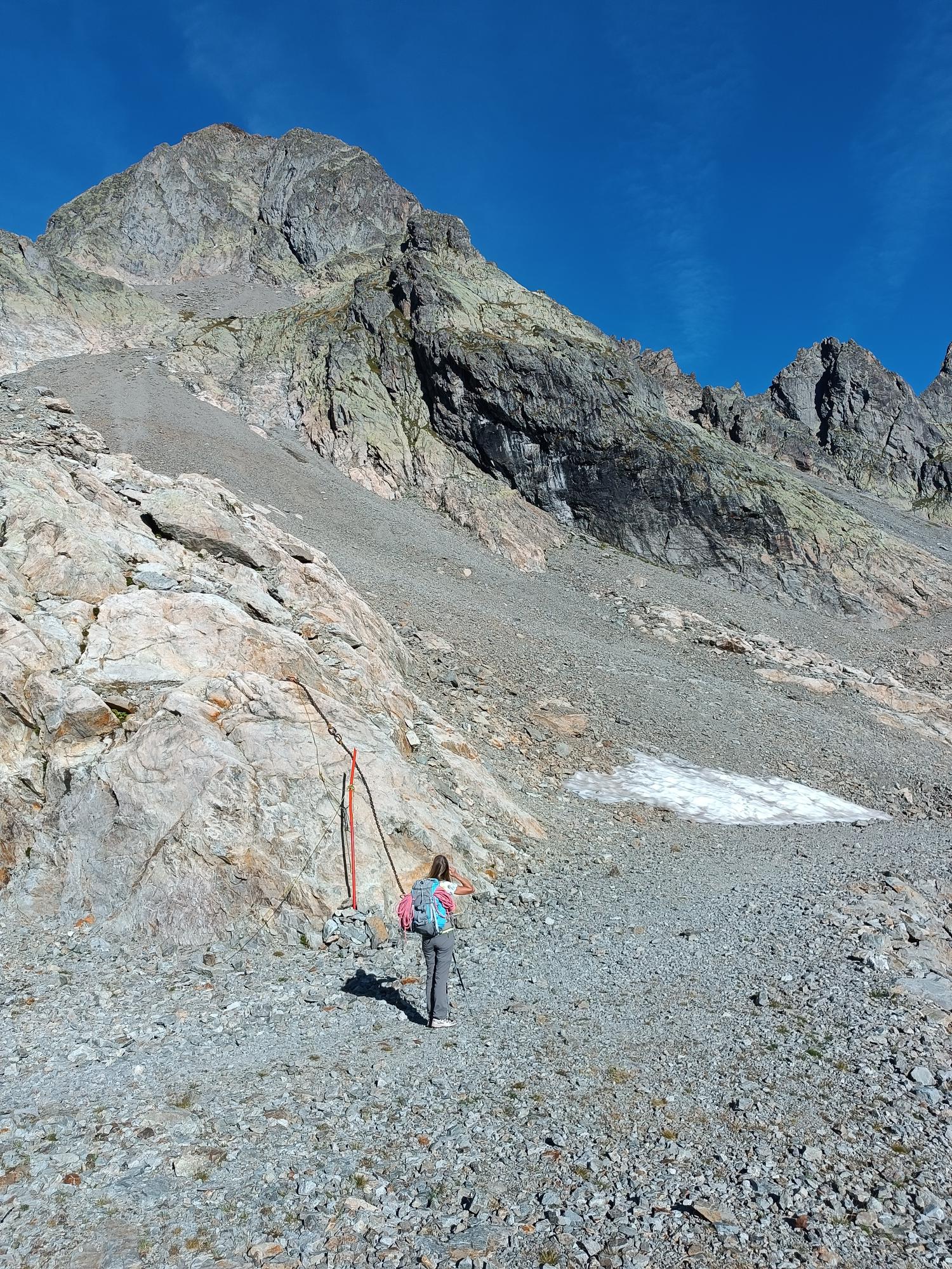 On traverse ce pierrier pour récupérer la suite quelques petits mètres à droite du point le plus haut sans changer de versant. Goujons invisibles.