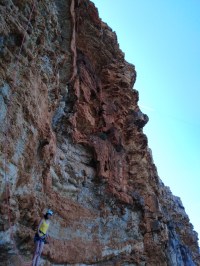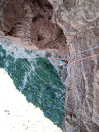 On attend les filles qui descendent avec nos cordes, avec un peu d’inquiétude car un peu d’attente. Finalement c’est bon, tout le monde est là, on récupère nos cordes médiocrement lovées par ces dernières en ont rigolant et on part à pied, décrochés, encore à moitié dans le vide (je me méfie à chaque fois que je tombe c’est sur les marches d’approches) jusqu’au point de départ : le connu « Ouvreur de Bouse » qui nous permettra de commencer pour s’échapper sur une autre voie peu connue car équipée récemment : « au milieu de nulle part » ! Ça sent l’aventure.