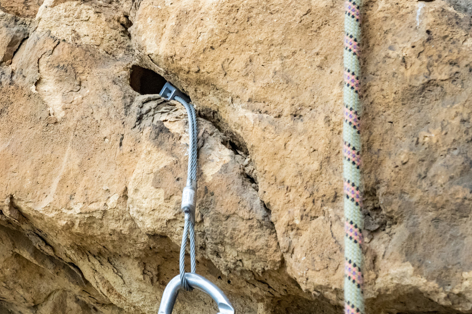 L4 : 5c, 60 mètres; Longueur plus mystérieuse : d’après le topo 2001, suivre la fine fissure (désormais réequipée en « vieille canaille »), mais il est plus logique (surtout depuis l’équipement de la ligne de gauche) de remonter la cheminée de droite (trois plaquettes un peu pourries). On franchit un surplomb physique puis on prolonge par une seconde cheminée. Relais sur les plaquettes de « vieille canaille » (qui ne gêne pas la voie que nous gravissons).