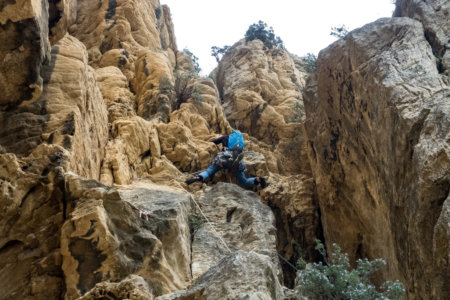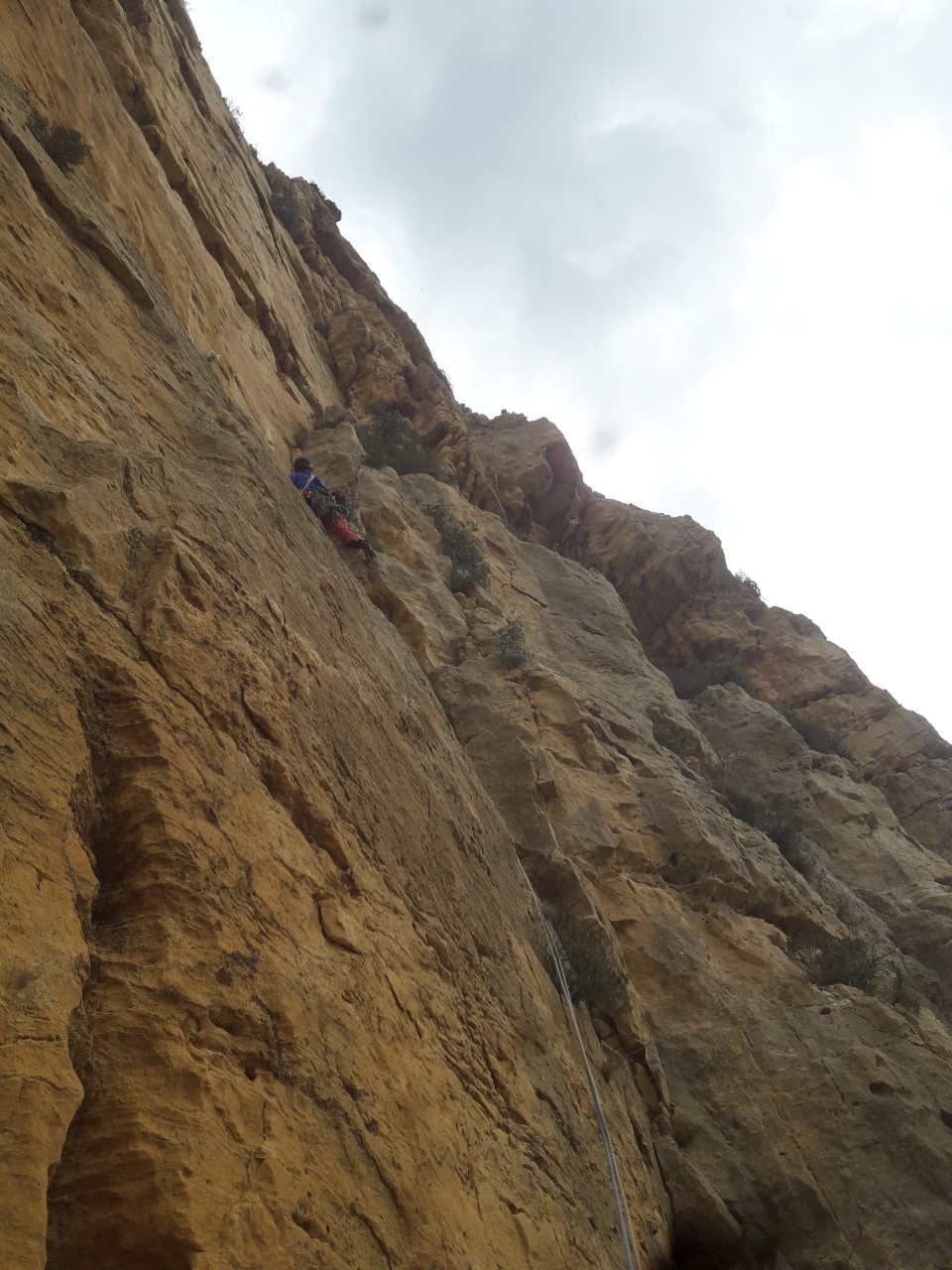 Et finalement, ce sera une bonne surprise au rendez vous : malgré de très nombreux blocs de toutes tailles à purger, des prises peu rassurantes et des jardins qui offrent toutefois des relais confortables, l’escalade est agréable, sur un rocher parfois sain, raide et bien prisu. L’ambiance dans le haut devient vite aérienne, et c’est avec un grand plaisir que l’on évolue de manière autonome dans ces grands murs tourmentés. Je pensais que les cotations seraient très sèches, et il n’en est rien : elles ne sont absolument pas exagérées, au contraire : je les ai trouvées plutôt abordables, comme partout dans ce petit massif (je le pensais car la voie « baudrier d’orion » reprendrait, d’après l’équipe Catsoyannis/Coquillat leur voie de 1980, faisant grimper les modestes 5c à du bon 6b+; je m’attendais donc ici à la même chose, mais je pense finalement que la voie « baudrier » ne reprend en fait pas la Catsoyannis/Coquillat). Pour les habitués du terrain d’aventure sous toutes ses coutures, cette voie pourrait être recommandable!