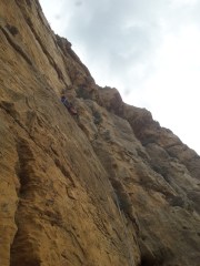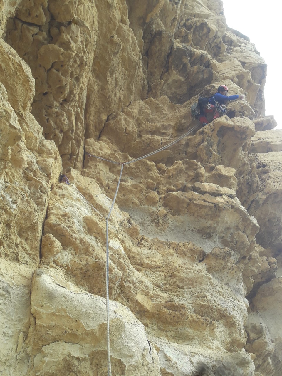 L2 : 5c, 30 mètres; Traverser à gauche sous le toit (bon rocher, un piton) jusqu’à un jardin que l’on remonte (facile mais exposé). Relais dans une mini niche.