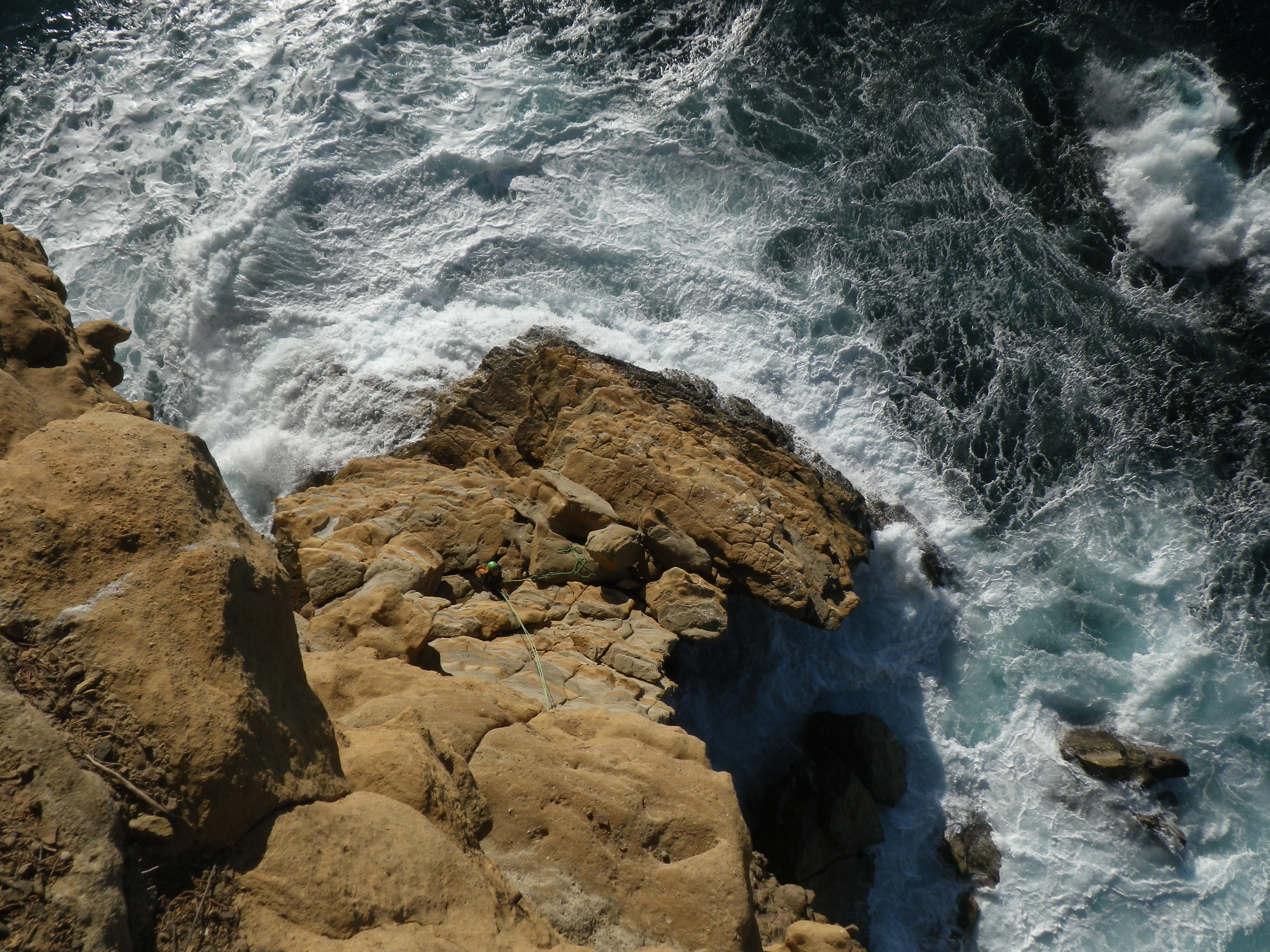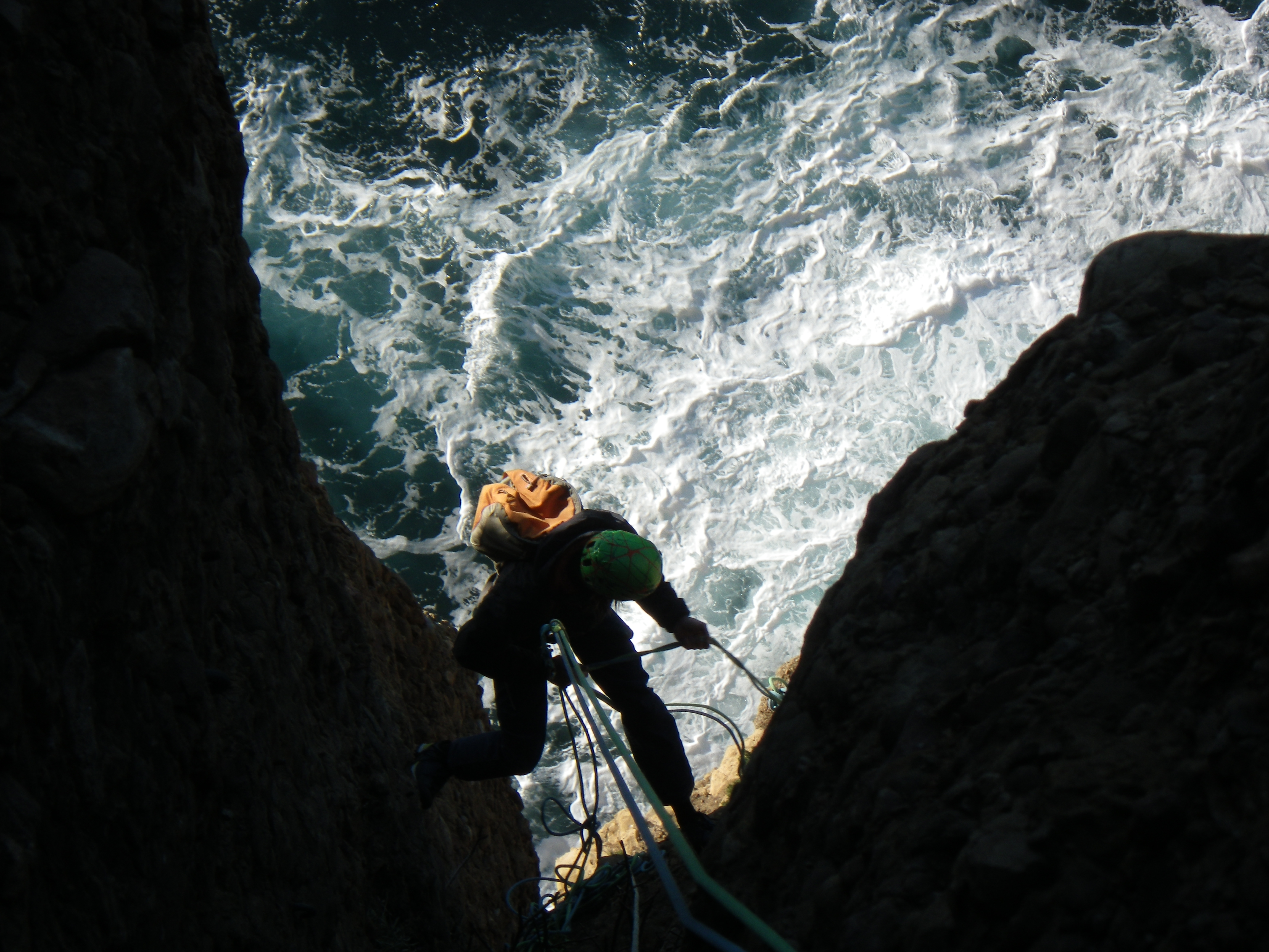 Deux gamins sous la pluie est une voie magnifique, partant du bord de l’eau et gravissant une paroi d’abord de grès stratifié aux couleurs chaudes, puis composée d’un conglomérat solide et agréable à grimper. Le cadre y est aussi unique qu’exceptionnel, car le secteur isolé est impressionnant et superbe, et l’ambiance au rendez vous. Ici, la mer peut sembler encore plus turquoise qu’ailleurs et le bain est possible au pied des rappels.