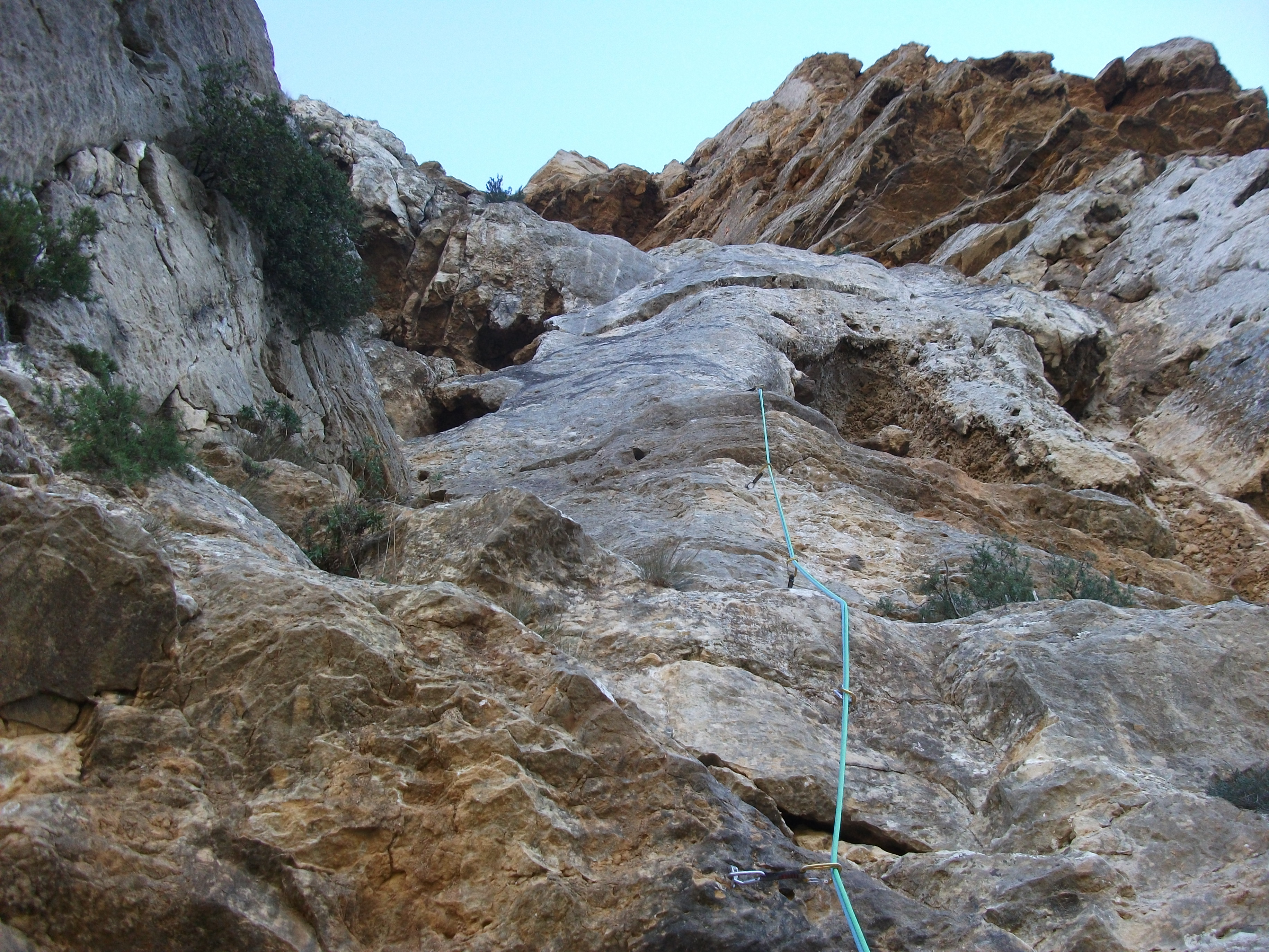 L2 : 6a+; Rampe en ascendance à droite (crux délicat à la fin) puis courte zone de gradins et enfin mur raide facile et prisu.