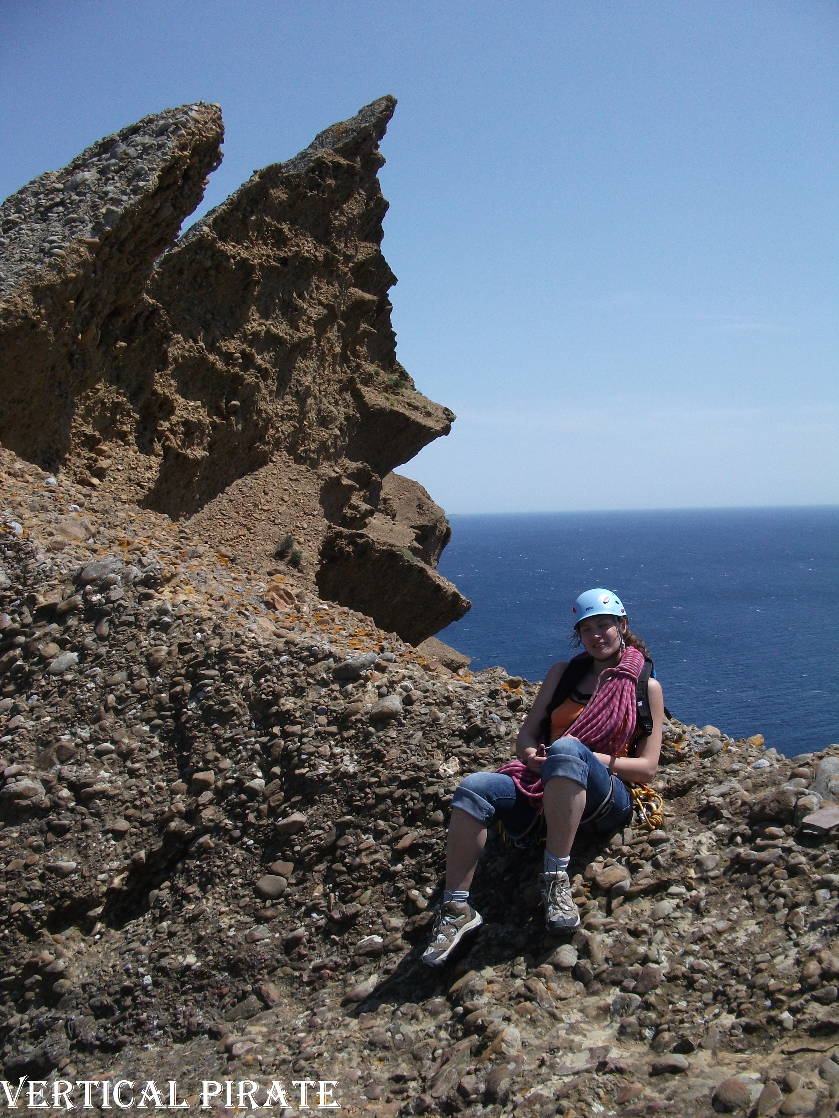 Nous étions suivis de près par une autre cordée, menée par un vieux ch’noc qui, en plus de décrocher mon relai sans ma permission, m’ a fait l’honneur d’un rentre dedans a tendance machiste.. (« Les belles femmes comme toi, c’est comme le voilier qui mouille en bas : soit on les entretient tous les jours, soit elles nous laissent tomber » merci… on ne se connait pas mais merci…) Bref…. J’ai pris sur moi pour rester concentrée sur la beauté de la voie et du paysage : 4 jolies longueurs, mi dalle, mi dièdre, dans du poudingue. Le rocher ne semblait pas effrayant, au contraire il donnait très envie de jouer ! La cordée derrière moi semblait apprécier beaucoup moins, et j’ai entendu les acolytes du vieux ch’noc rejoindre le relai que je venais de quitter dans des bruits de chute de pierres…