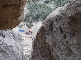 L4 : 3c; Longer la vire à droite puis descendre de deux mètres au niveau d’un goujon avec cordelette. Relais plus loin à droite.