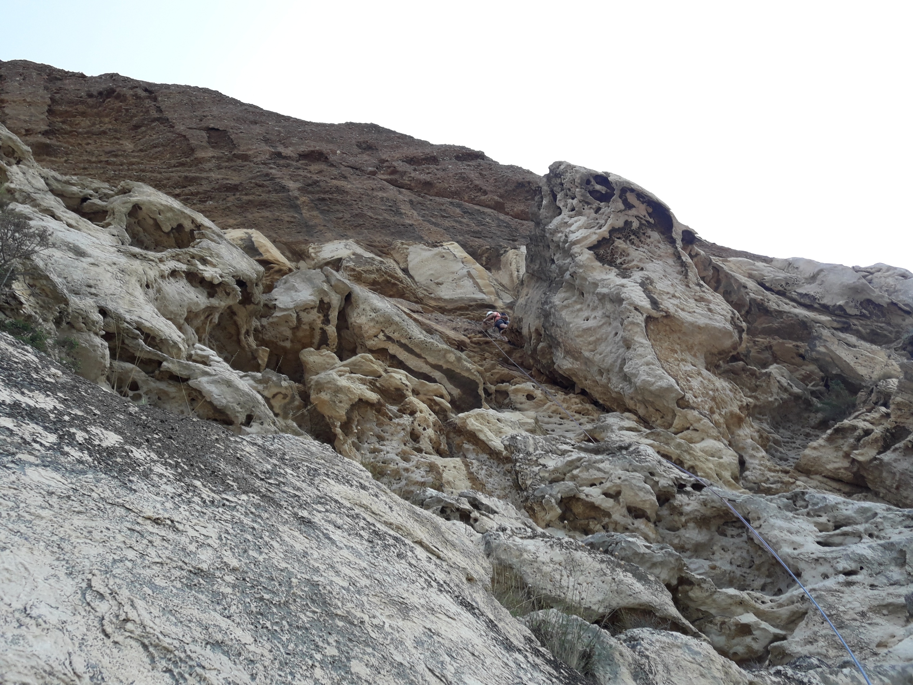 Les longueurs sont jolies et variées, avec des difficultés bien réparties et un enchainement logique, bien que dans l’ensemble on traverse plus que l’on monte : cela pourrait paraitre surprenant, mais c’est en réalité à la fois rigolo et à l’inverse de ce que canaille a l’habitude de proposer. Ici, l’escalade est, comme d’habitude, aérienne, mais pour une fois les relais aussi. Point de vire extra large pour s’allonger tous les 15 mètres, et pas de baumes suspendues. On fait nos relais plein vide, et si l’on suit largement les strates rocheuses, on ne peut pas courir sur ces vires. Nous sommes loin de la Philémon! Les « vires » offrent peut être même les passages les plus intéressants : un peu de recherche d’itinéraire, ramping pas si commode, et traversée gazeuse su une bande de grès. Pour évidemment terminer par un chouette mur de conglomérat.