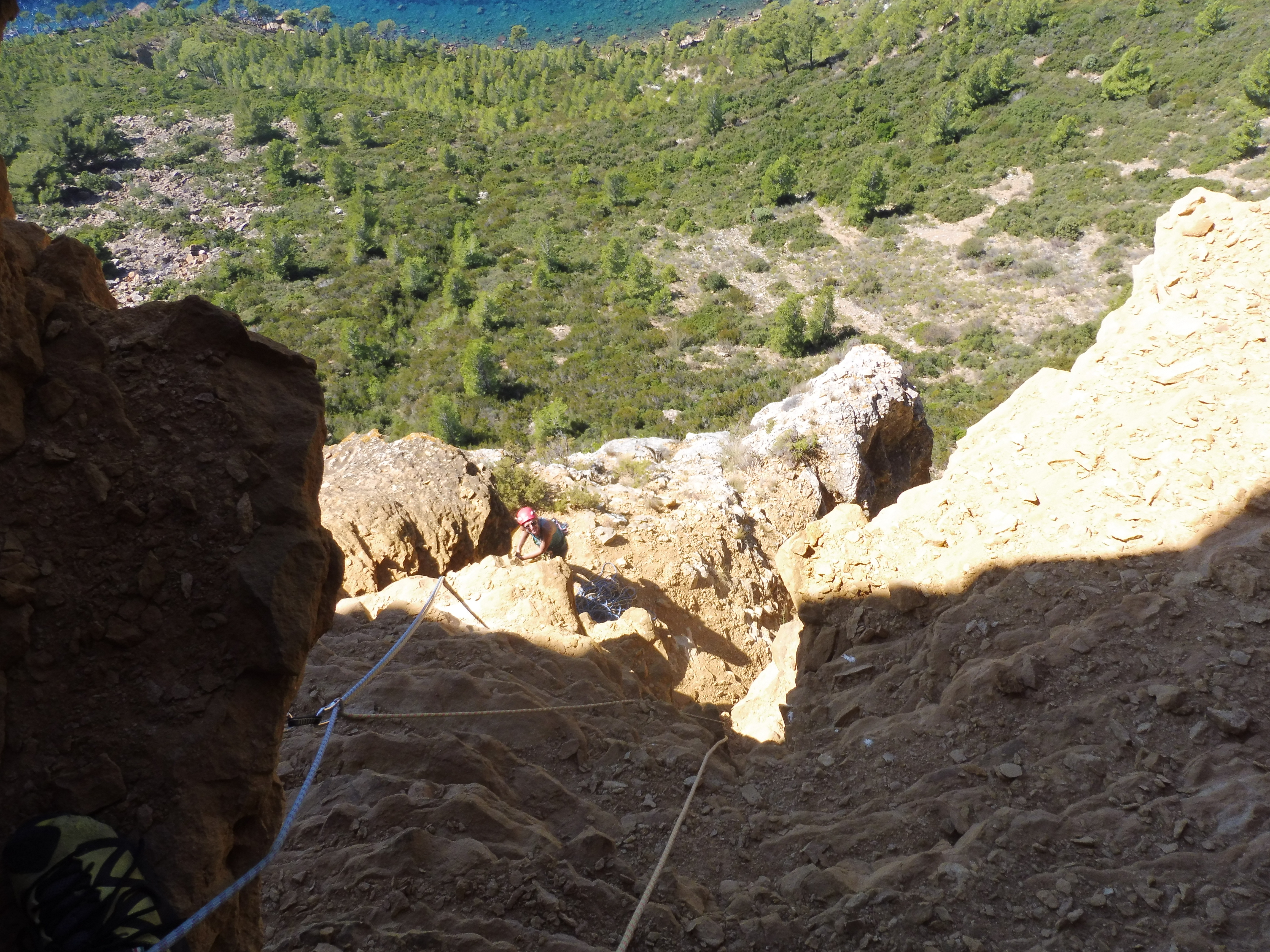 Certes, « Ocre’n wall » n’est pas la plus belle voie ni la plus classique de Cap Canaille. On y grimpe plus au nord que le classique secteur d’ouvreur de bouse, et l’itinéraire est donc moins parcouru. Cependant, il se déroule sur le même beau rocher, solide en dessous, des falaises Soubeyrannes. Le petit bémol vient du fait que les longueurs soient un peu trop blocs, sans être spécialement vilaines, et cela a apporté probablement un léger défaut de fréquentation : il reste encore quelques chips ! Mais après tout, avec une centaine de voies entre Cassis et la Ciotat, ne deviendrais je pas mauvais public ?