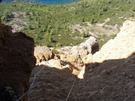 L5 : 4c; Très courte longueur, relais au sommet sur un petit arbuste fébrile ou en contrebas à l’épaule ou loin sur un pin.