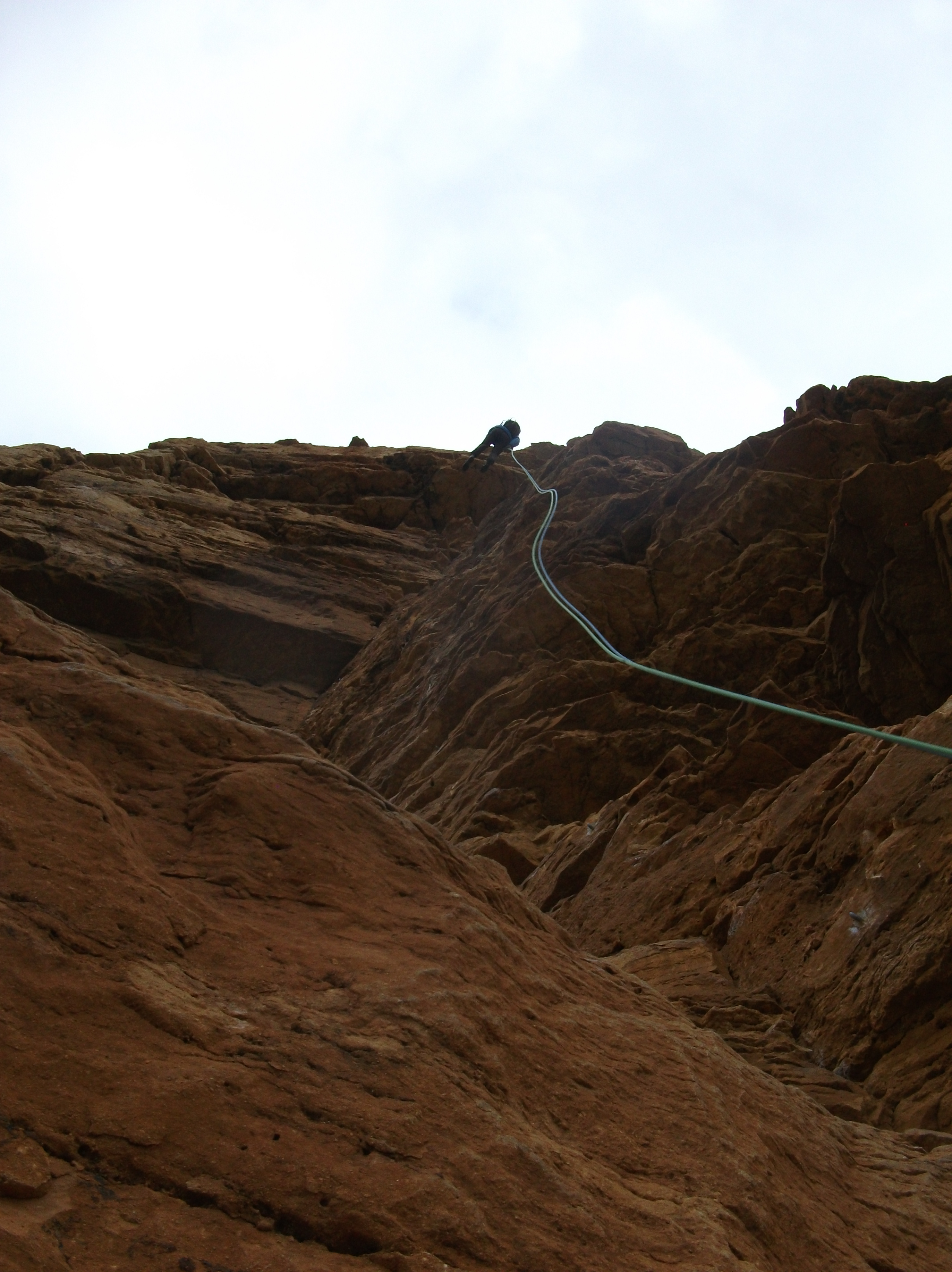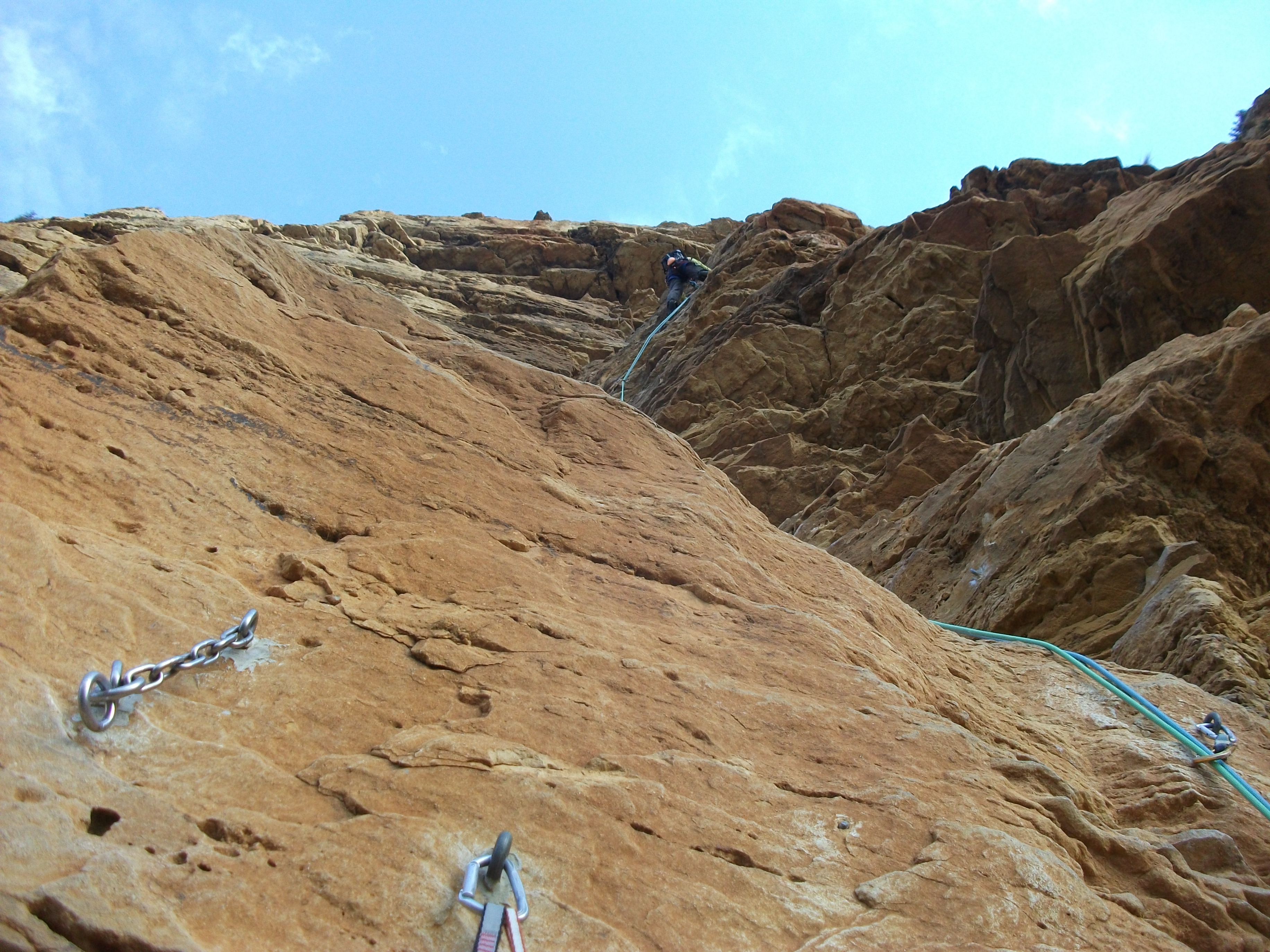 L3′ : 5c; Cheminée très sympa, puis assez longue traversée à gauche pour récupérer le rappel médian de descente.