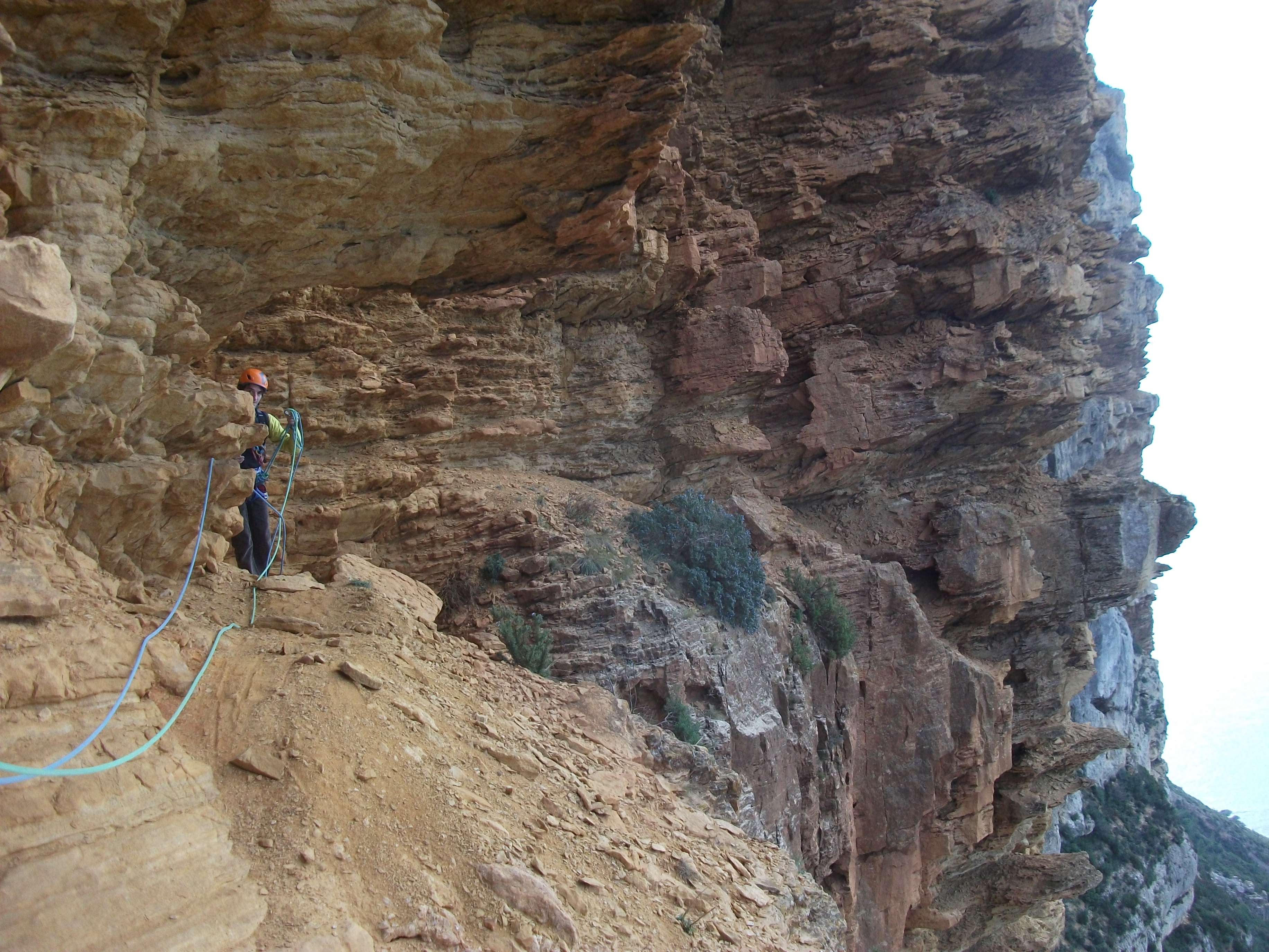 L3 : 6a+; Court mur raide, très beau, réglettes et bonnes prises. Relais sur la terrasse (rappel de descente).