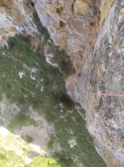 beau pas d’équilibre dans une superbe ambiance, puis une suite sur un mur qui s’incline très prisu. 6a+ 35m.