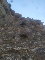 C’est Nicolas qui part dans la première longueur qui démarre par une petite fissure, s’en suis un mur un peu plus raide et bien prisu. Un petit pas pour sortir d’un léger surplomb, une petite traversée sur la droite et un relais dans une niche achève ses 30mêtres. Le 6a+ annoncé nous semble généreux.