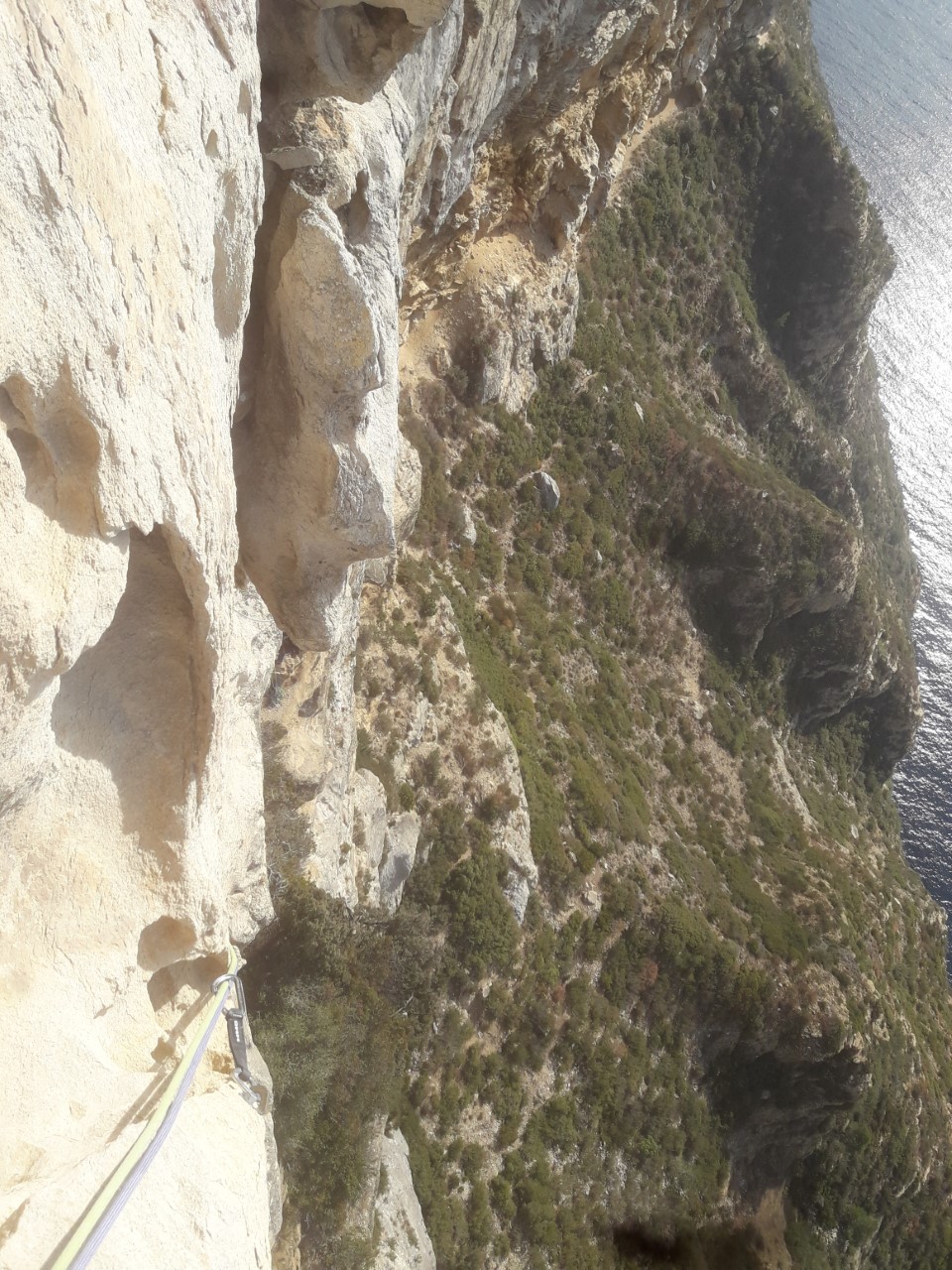 L4 : 6b+; Très beau départ physique, puis traversée à droite grandiose, aérienne, technique. Longueur courte, à enchainer avec la cinquième pour éviter un départ malcommode du quatrième relais sinon.