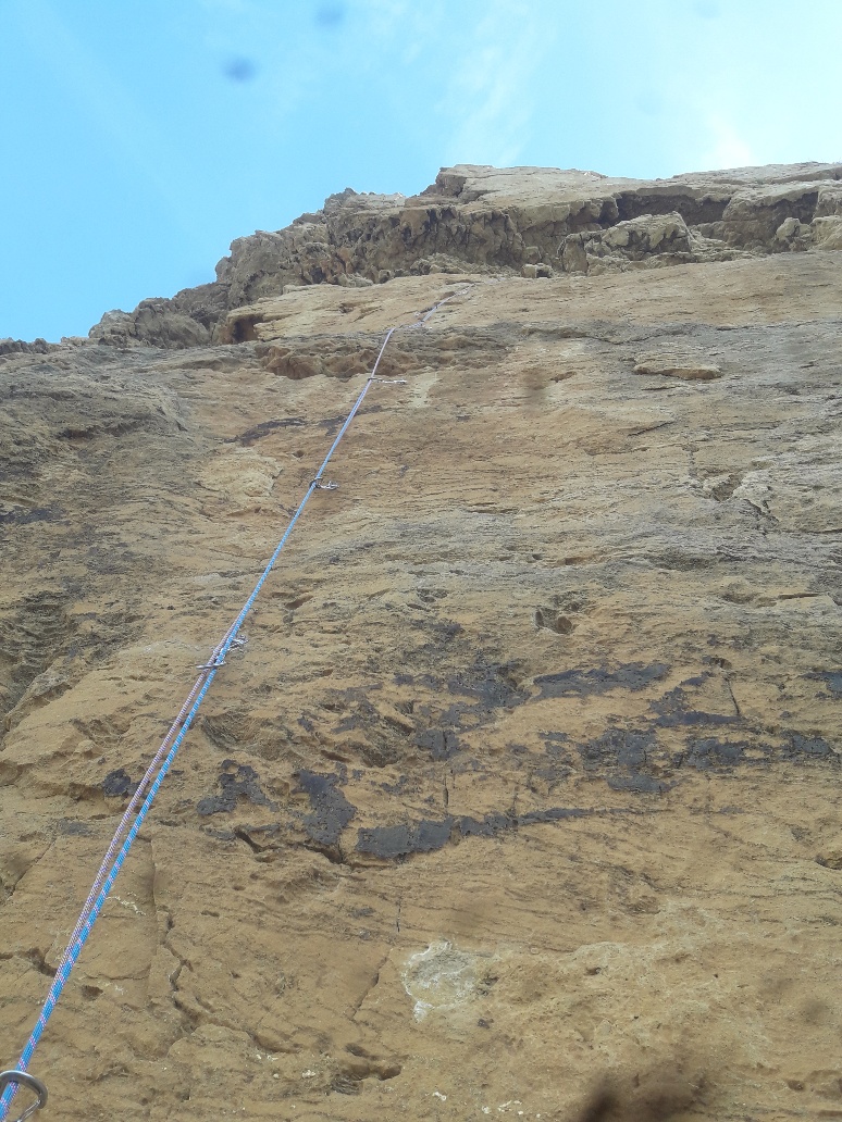 Une voie fantastique! Nous l’avions repérée récemment lors de notre parcours de la « Catsoyannis/Coquillat 83 », elle m’avait alors interpelé. Elle parcours un mur de grès coupé au couteau, lisse d’apparence à part une cavité marquée formant une large vire. Mais qui du coup offre un toit! Il n’y a définitivement pas grand chose à jeter dans cette voie; rien, à vrai dire! Toutes les longueurs sont très belles, dans des styles différents. Un tout petit peu de dalle, des murs raides parfois techniques, souvent physiques, et un superbe toit, bien plus facile qu’il n’y parait. Même la large vire entre la seconde et la troisième longueur est vite oubliée, car lorsque, dans le mur sommital l’on se penche en arrière, la mer est bien presque 300 mètres sous les pieds, « presque » à l’aplomb.