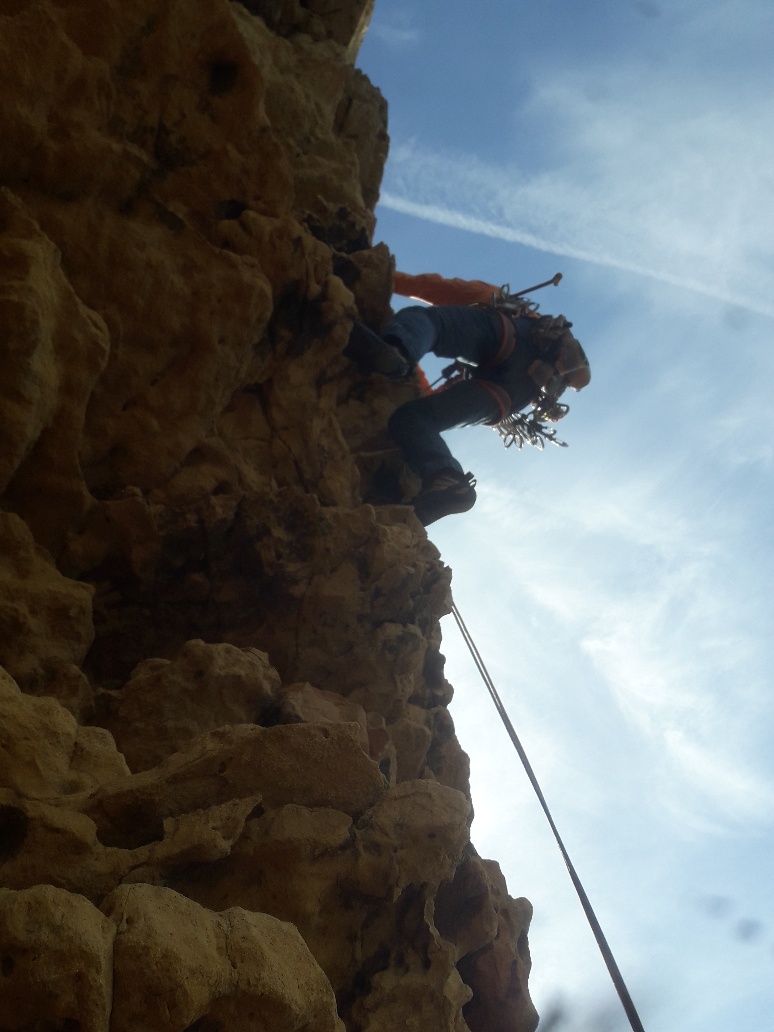 L4 : 6b+; Très, très beau toit à bacs, puis escalade aérienne, physique sur un pilier (ne pas s’arrêter au premier relais à gauche juste après le toit).