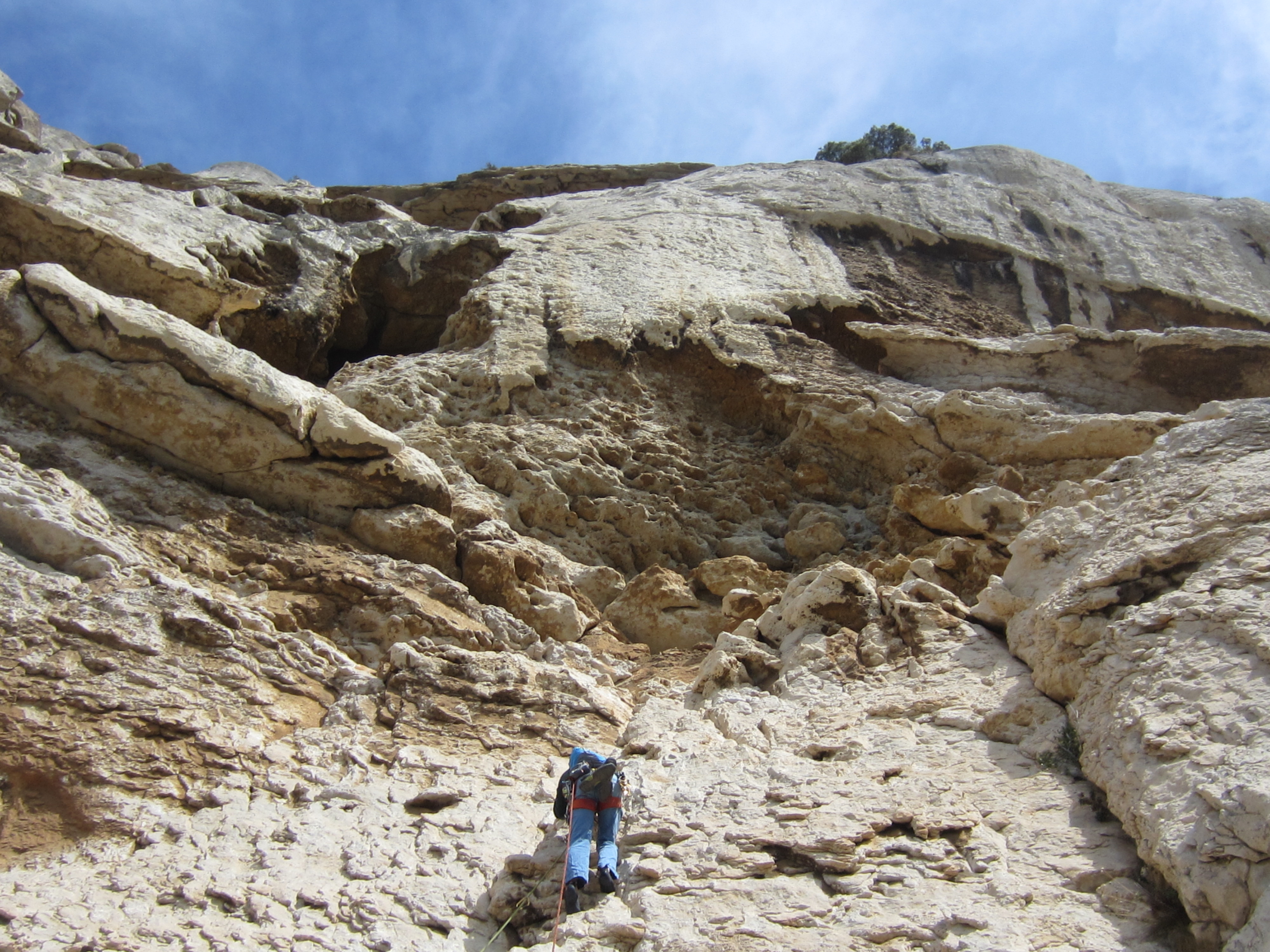 L1 : 6a, 20 mètres; Départ facile dans du rocher blanc un peu fragile, puis