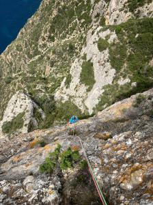 L4 : 7a+; Courte traversée à gauche puis fissure dièdre magnifique (6b) jusqu’à un bombé court qui passe en tirant aux dégaines. Fin facile, relais à droite.