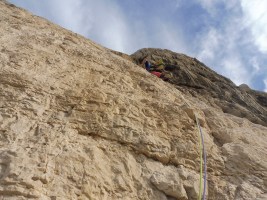 L1 : 6c; Premier mur difficile à lire mais peu raide, puis section plus raide et physique, teigneuse. En fin de longueur tirer à gauche et ne pas rejoindre le relais chainé de rappel.