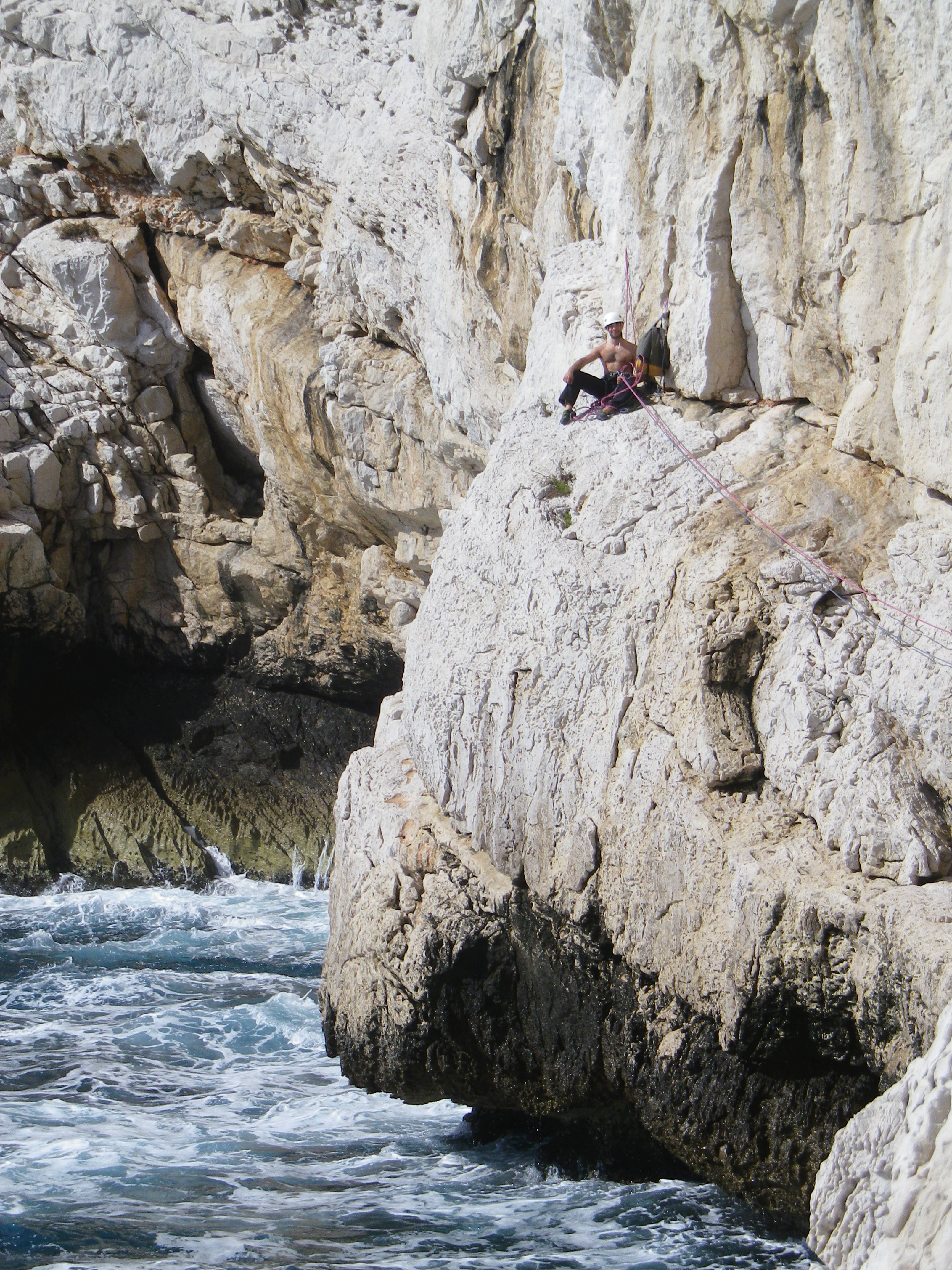 La première l’est, en effet. Un modeste 4c nous pose au pied d’un dièdre. Joli rocher, typique des Calanques, avec des vires. Belle ambiance, détendue. Il faut en profiter…