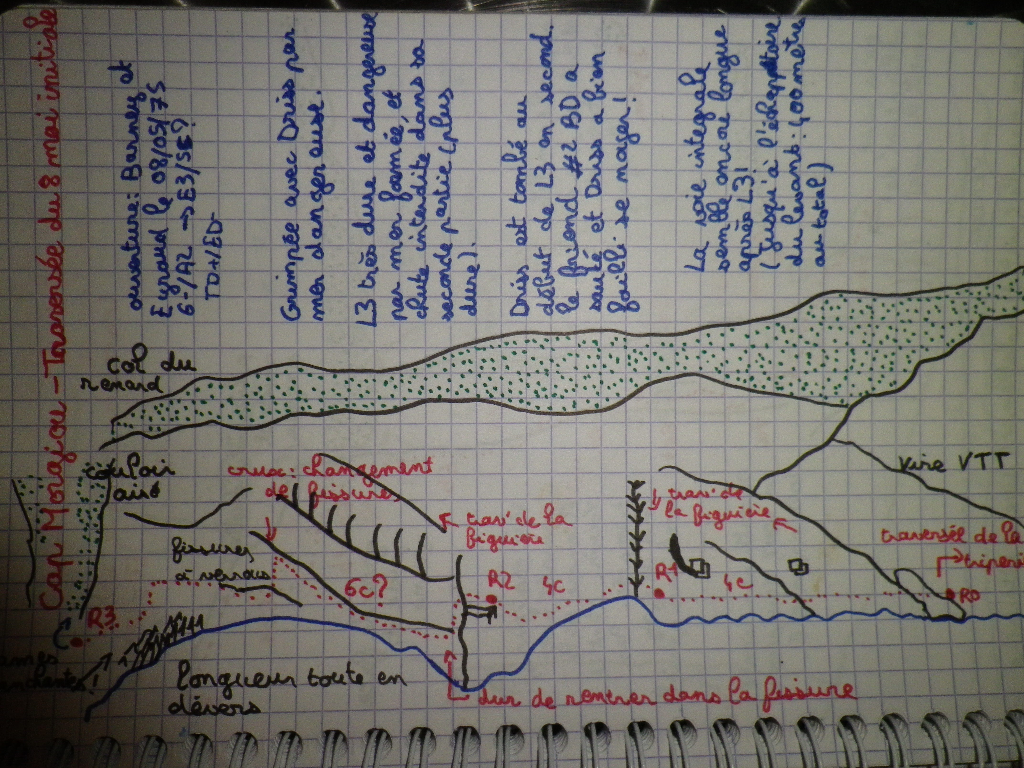 Au cap Morgiou, les traversées constituent les itinéraires phares. Coté Morgiou, ceux ci ont tous été réequipés, sans concertation avec les ouvreurs. Fort heureusement, il reste des itinéraires sauvages de l’autre côté, face au large… C’est ainsi que nous sommes allés voir la mythique « traversée de la triperie » et son fameux passage en VI expo. Nous ne savions pas, à l’approche, qu’il existait une traversée non mentionnée dans les topos modernes, partant du même point, mais dans la direction opposée, plus sérieuse encore…