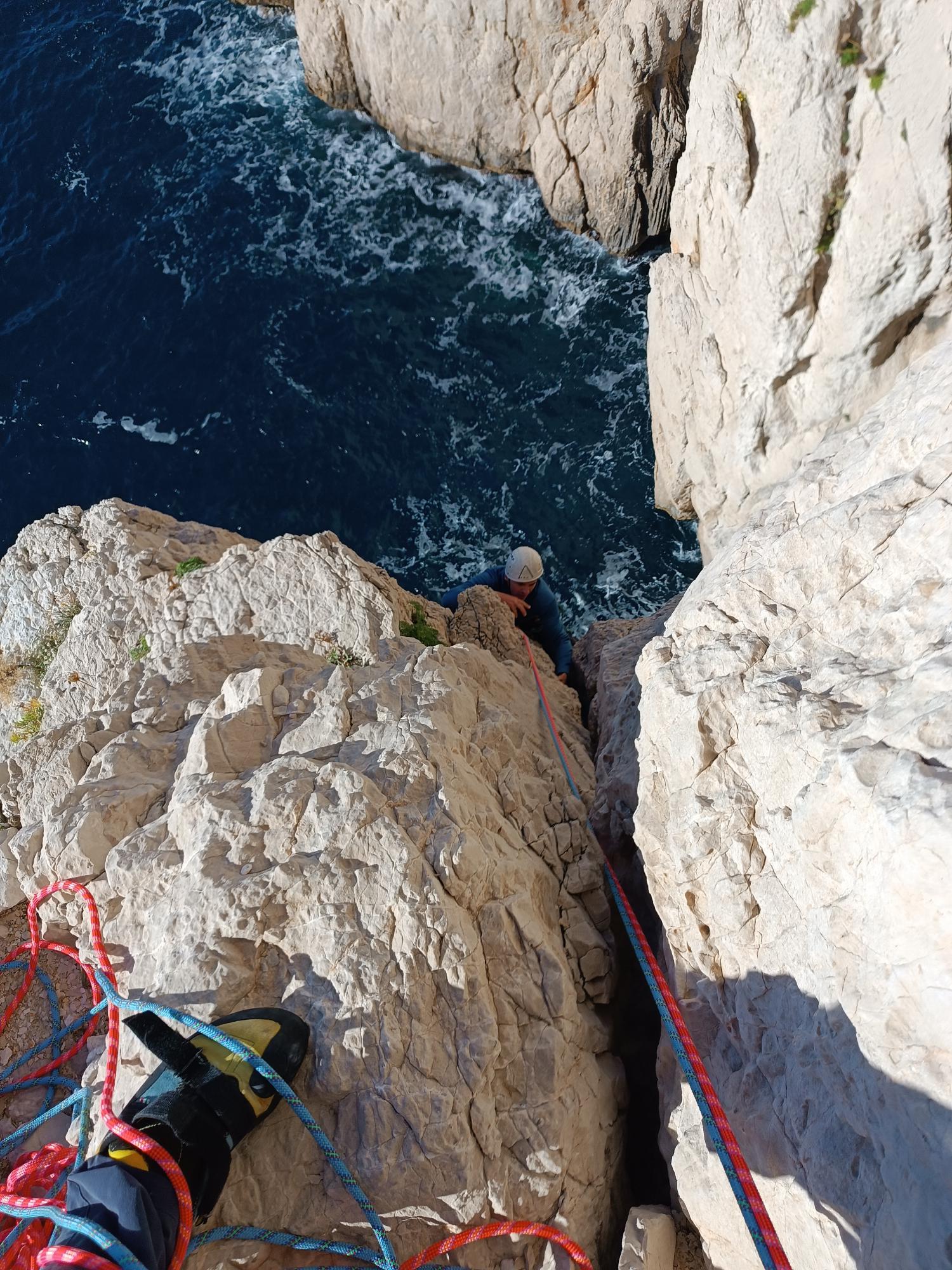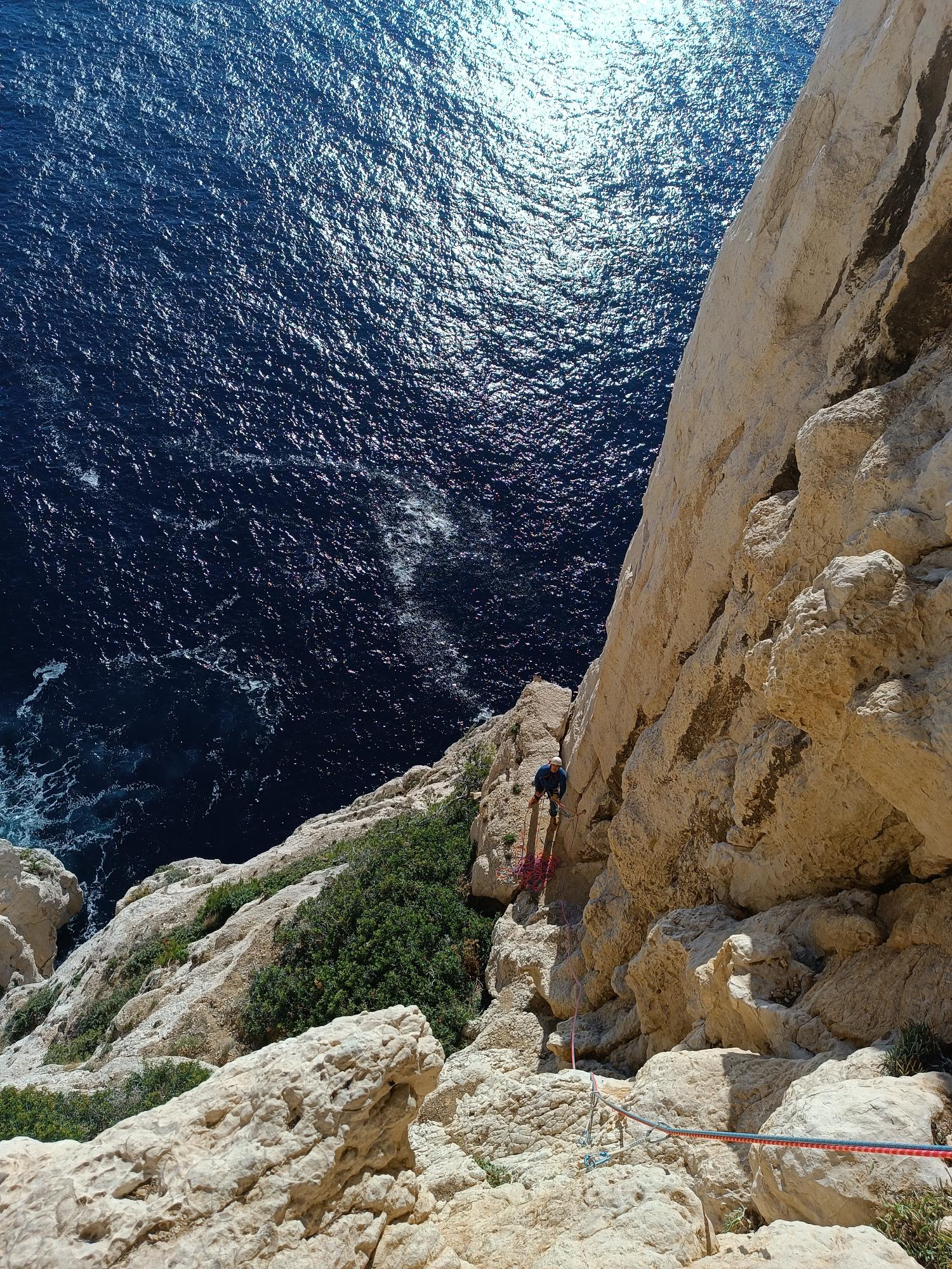 Encore une superbe voie sur ces belles falaises de Castelvieil, qui sont pour moi les plus belles du massif. Il s’agit de la plus facile de celles autour du fjord, un endroit remarquable : suite à un effondrement, un canyon marin s’avance littéralement dans la paroi. C’est une structure géologique différentes des Calanques : pour ces dernières, c’est l’eau douce venue de la terre qui crée le canyon plongeant dans la méditerranée (le nom changera sur une autre mer ou un océan, c’est une appellation d’origine contrôlée !).