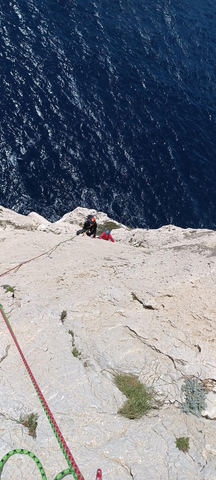 Une voie pour les fans de Pink Floyd au nom remasterisé ! En préférant supposer que le jeu de mots ne porte que sur les fruits de mer (nous sommes toutes fois sur la face cachée de Sormiou…), bien que les autres voies du secteur pourraient laisser envisager le pire. Mais comme ses voisines, il s’agit d’une superbe voie, en rocher blanc parfait, qui pique tout de même un peu les doigts. Malheureusement, la voie est courte et ne parcourt que la partie inférieure de la falaise, de la mer jusqu’à la grande vire sous le dièdre Guem. On y accède en rappel, ce qui est toujours la promesse d’une petite aventure (en évitant les houles d’ouest !), pour accéder au ras de l’eau. Il faudra ensuite remonter ! Une petite astuce pour ne pas mouiller la corde : descendre uniquement avec un brin le dernier rappel (nœud de corde obligatoire !) en clippant les deux brins dans les dégaines que l’on pose. Ainsi, elle s’arrête régulièrement en tombant et ne finit, en théorie, pas dans la mer.