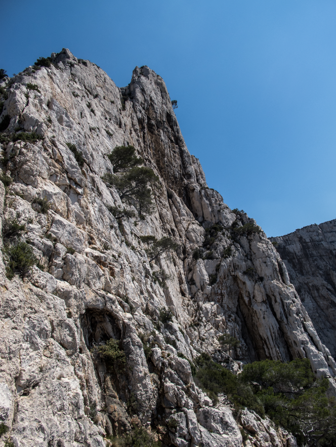 L’éperon des pins, D+; III; 5c; 100 mètres, non équipée. Très sauvage, avec un accès relativement long.