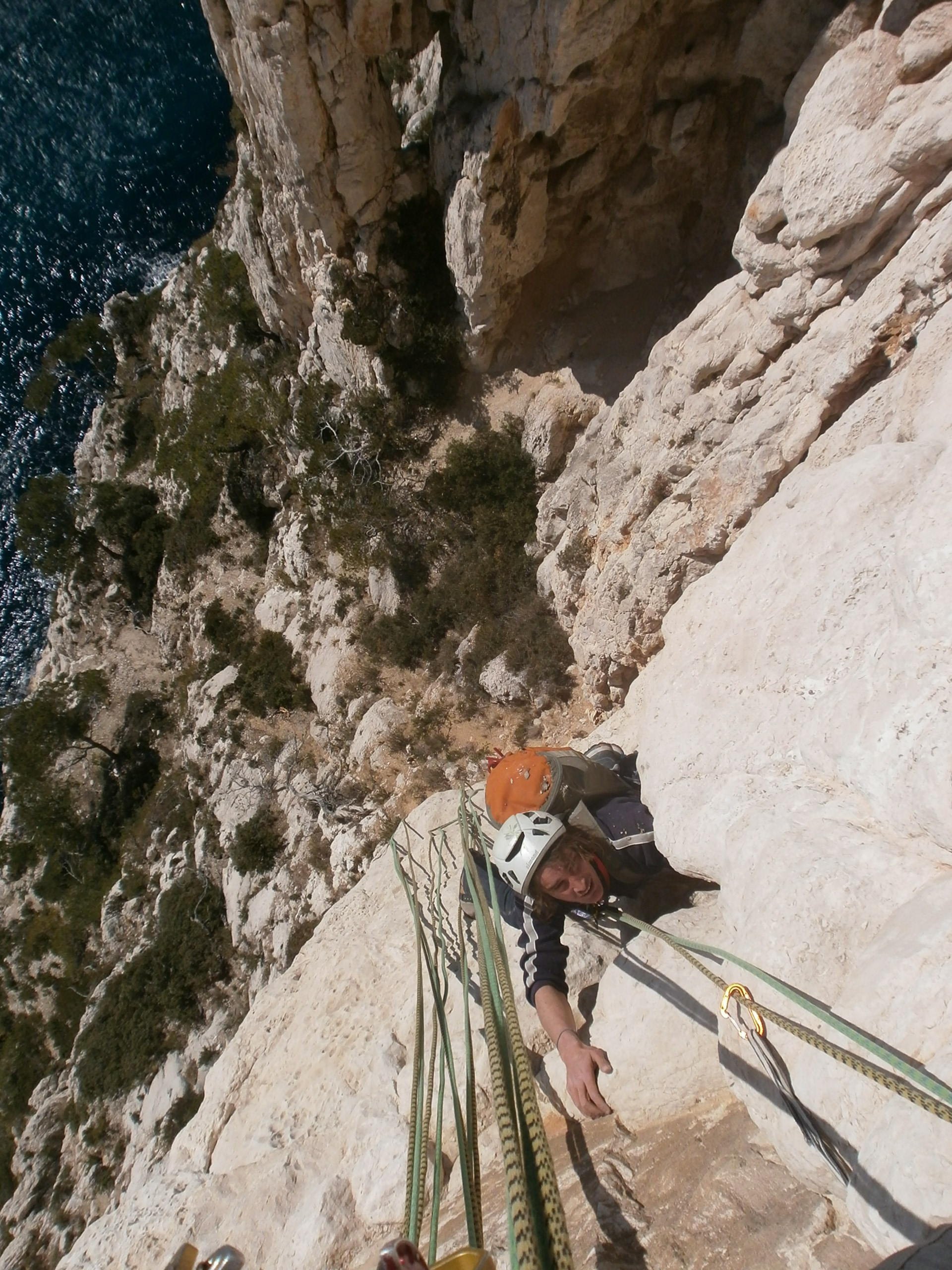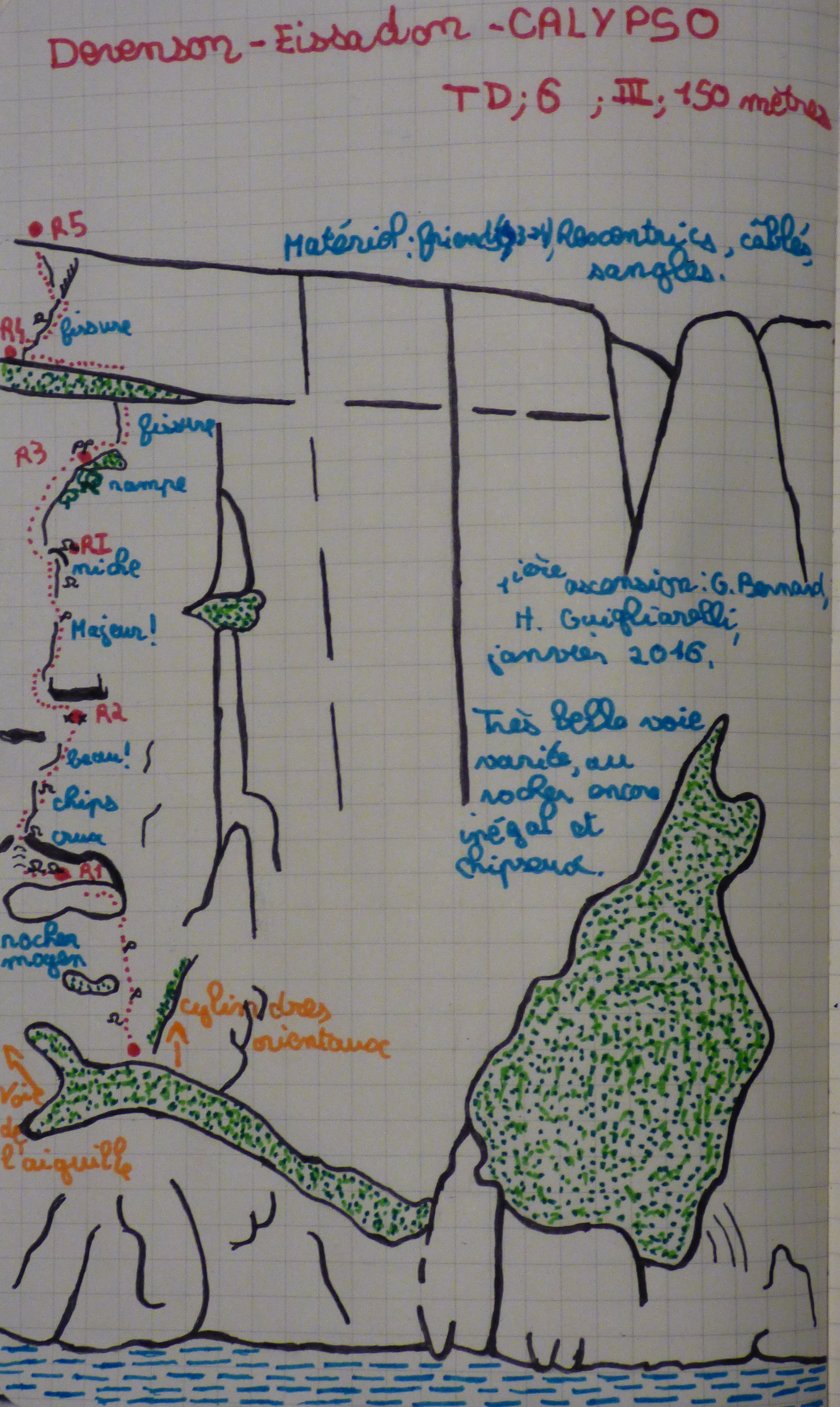 Calypso est une voie toute nouvelle, ouverte en 2016 par Gilles Bernard et Hervé Guigluiarelli, deux grimpeurs sudistes fort habitués des ouvertures en tous styles, du plus aseptisé au vrai terrain d’aventure peu recommandable. Cette voie est une vraie belle découverte, dans un secteur où l’on pensait que tout avait déjà du être fait. La ligne est impressionnante du bas, les deux compères pensaient trouver une ligne plus difficile. Pourtant, dans ce magnifique rocher raide, sculpté et rond des Calanques, les dévers sont souvent bien plus faciles que prévus. Le rocher demande encore du nettoyage et pas mal d’attention, mais cela va vite s’améliorer avec la fréquentation, et la voie sera alors plus que recommandable!