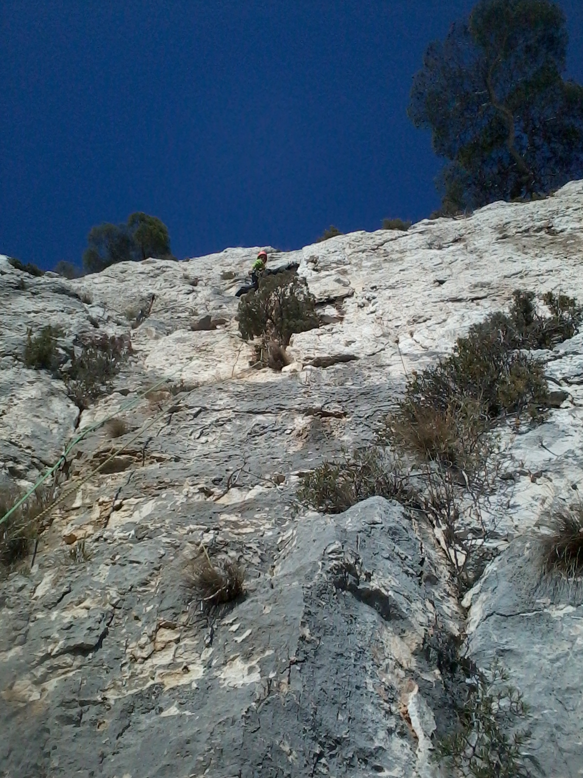 L2: 6a+, 40 mètres; Franchir le surplomb par la droite (pas évident et chipseux), et poursuivre par une belle fissure pourvue d’aragonite, rocher par toujours parfait, mais superbe longueur dans l’ensemble. Relais sous le toit impressionnant bien visible d’en bas, sur deux goujons.