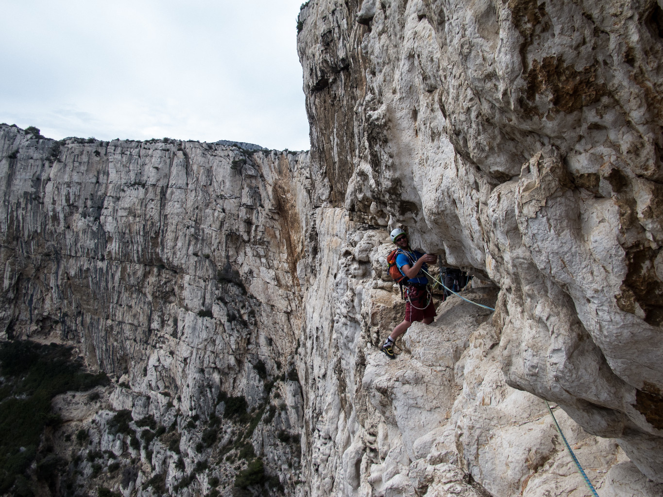 D’en face, la paroi fait peur. On repère d’abord le grand mur final, rouge et blanc, déversant. Ensuite, on remarque son socle, plongeant directement dans la mer. La possibilité de gravir cette belle paroi laisse dubitatif, et pourtant ! La voie emprunte un beau pilier, qui semble encore raisonnable, mais qui se termine justement dans le devers final. Heureusement, un tracé on ne peut plus astucieux et le rocher prisu des Calanques ont permis cette belle ouverture. Il fallait oser!