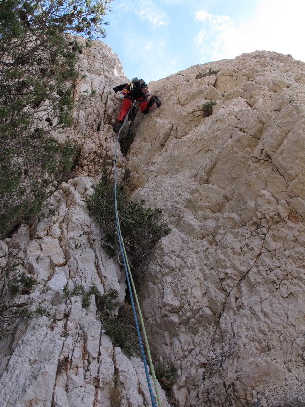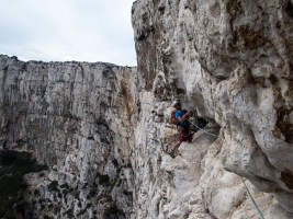 Dans l’ensemble, malgré des cotations sur le papier très abordables, la voie demande du vécu pour s’y faire plaisir. Tout d’abord, grimper 200 mètres sans un spit reste plutôt rare dans l’extrême sud de la Provence. Et ce sont 200 mètres qui demandent de la concentration, car le rocher est en général moyen, parfois bon, parfois mauvais. Cela va du terrain sablonneux aux blocs peu sûrs en passant par du rocher aux prises fragiles, mais on trouve de beaux devers et des gros trous, du gaz et de belles cheminées. Ajoutez à cela un peu de recherche d’itinéraire et in équipement rare et vétuste, nous avons alors une vraie grande voie qui, si elle n’est pas la plus belle du massif, reste très intéressante !