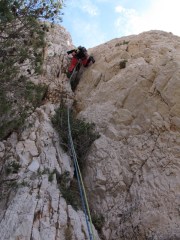 L3 : 5b, 35m; un pas au dessus le relais puis escalade facile le long du pilier. Relais sur un pin à droite. Rocher correct.