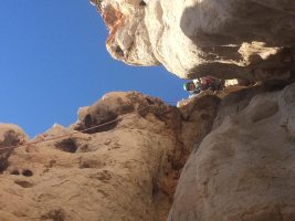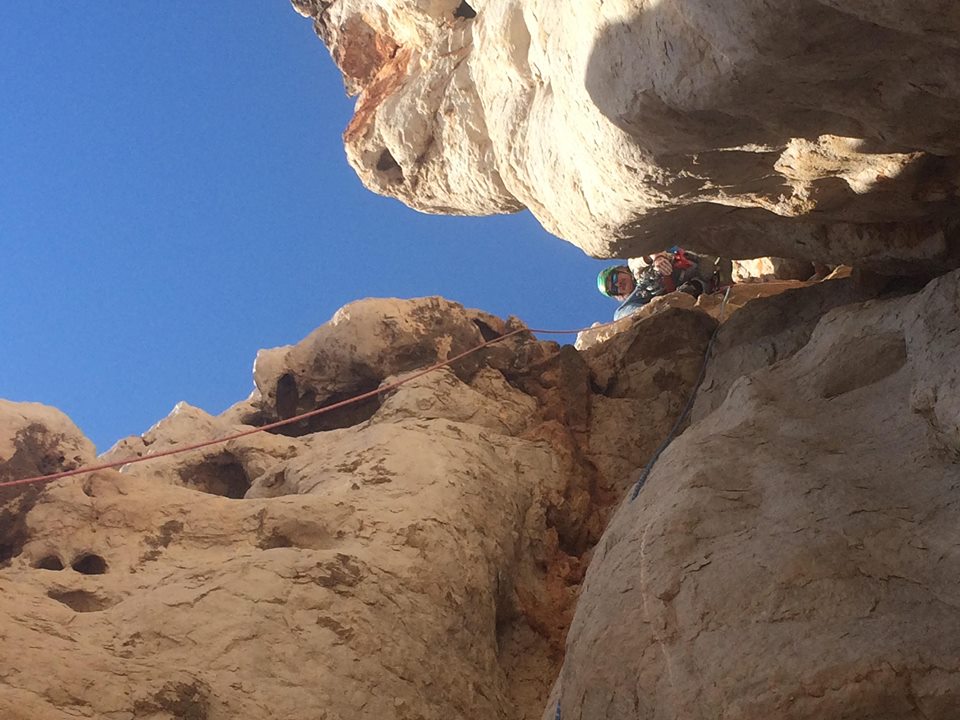 L2 : 6a, 40m; sortir de la grotte à gauche puis remonter un mur blanc au rocher délité (mauvais pitons, à compléter). Remonter ensuite les ressauts jusqu’à trouver un relais sur deux pitons (vire).