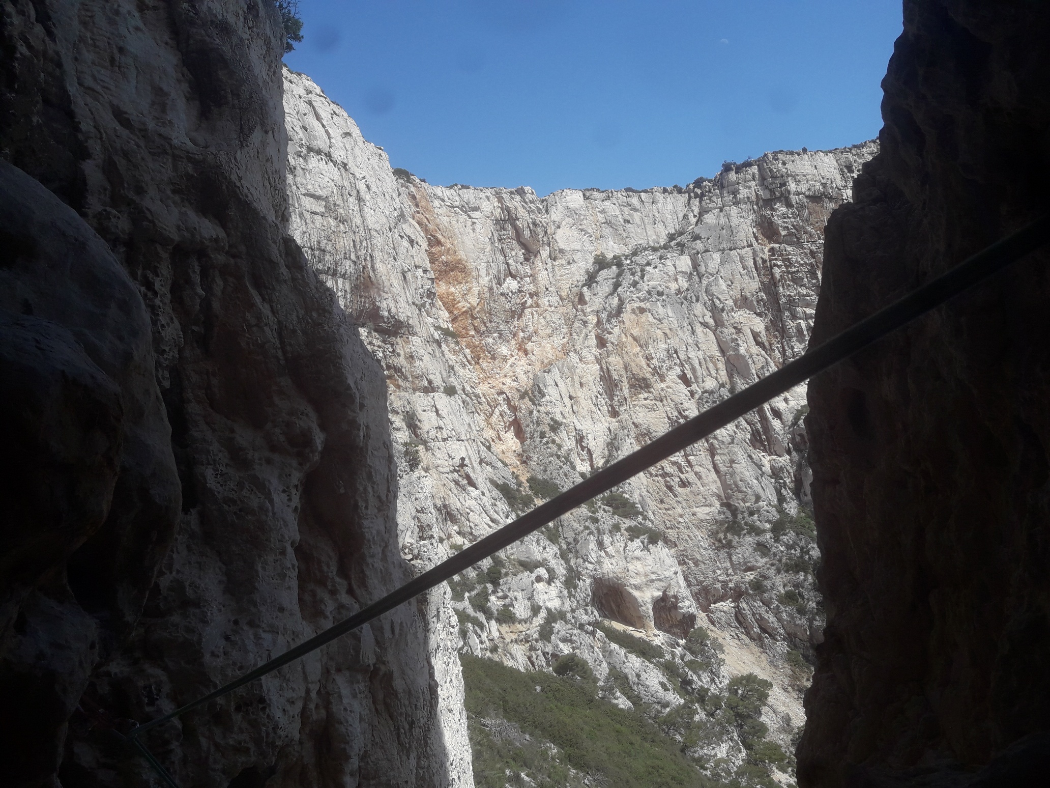 Coinceurs ou pas, enchainement avec une grosse marge ou sortie limite limite, il n’y a que peu de chances que cette ligne vous déçoive. Tous les passages sont beaux, et il y a même un boyau vraiment rigolo à passer, avec une sortie aérienne! Depuis la cheminée, la vue sur le cirque du Devenson est absolument sublime. Tranquillement assis à des relais confortables, la contemplation est de mise, tant sur la cheminée vermoulue que sur ces Calanques dont on ne saurait se lasser, ou encore cette mer turquoise…