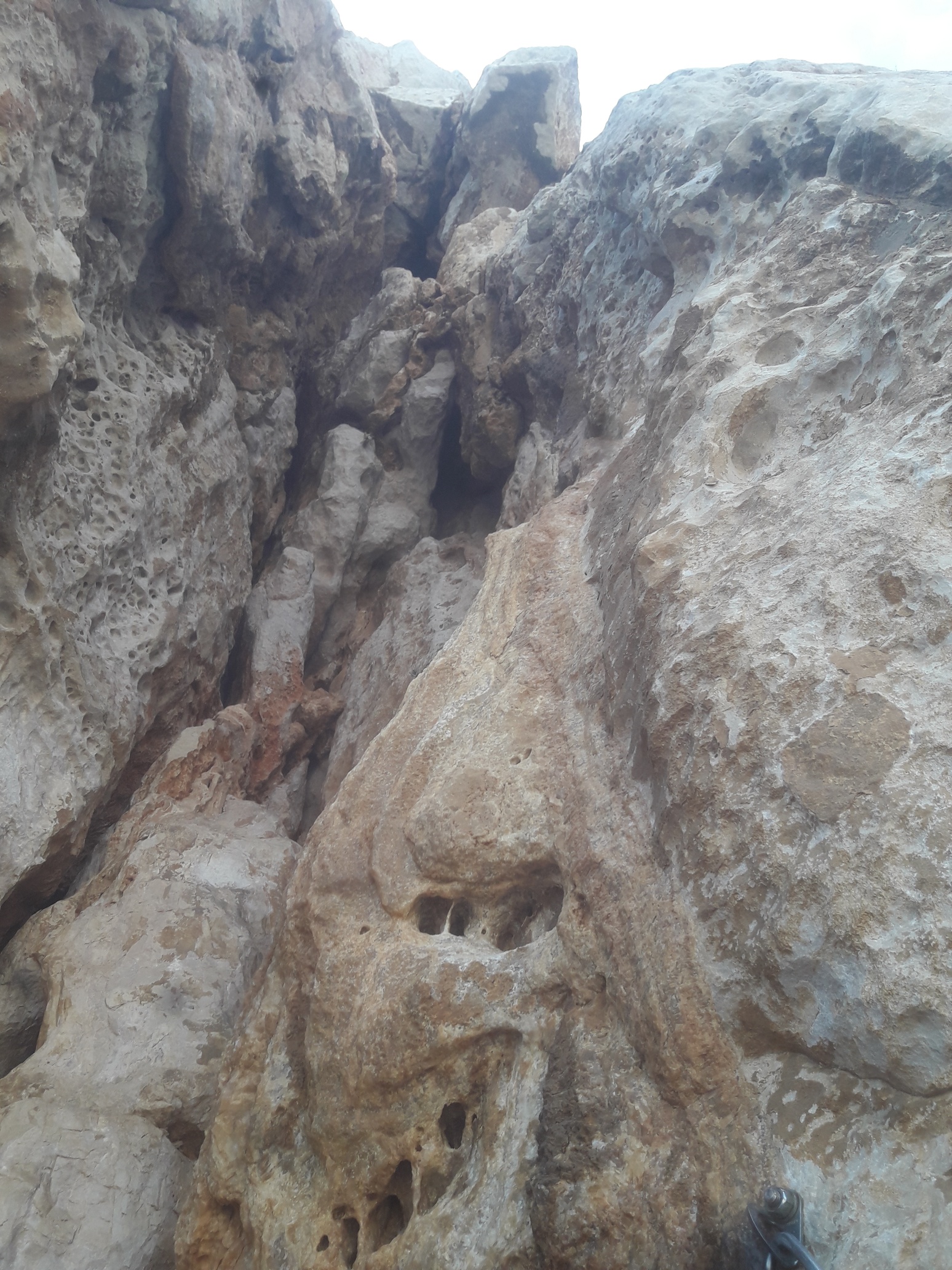 L2 : 6a; Mur peu raide mais aux prises rondes et fuyantes (passage initial probablement plus à gauche!), puis fissure raide, très équipée mais avec des ficelous pas toujours rassurants.