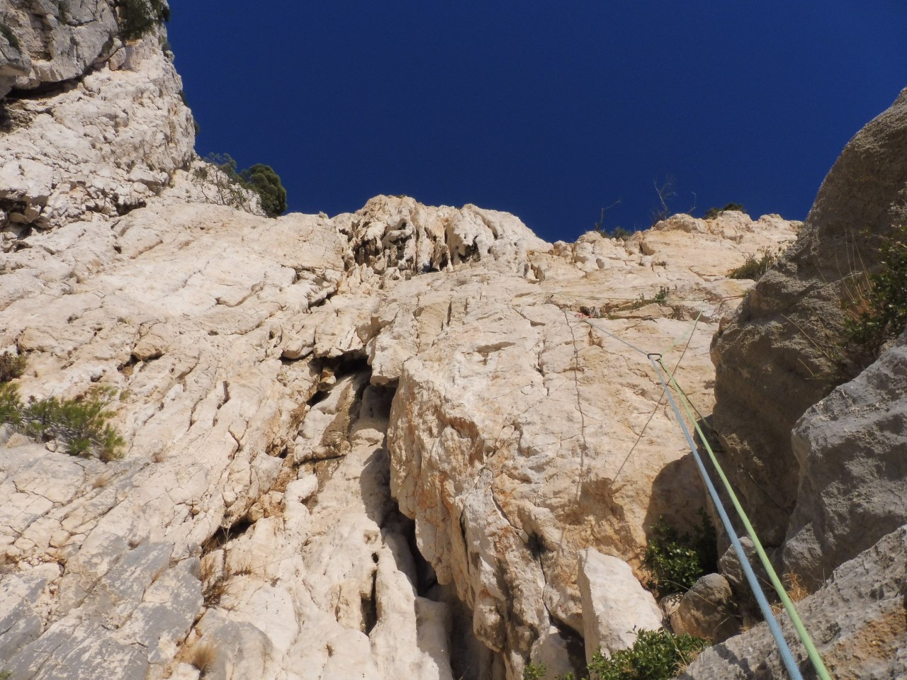 Accès : Non décrit sur ce site – Voir Topo Fédéral 2017. juste une petite indication pour la fin : Le second rappel doit nous poser dans un petit amphithéâtre, juste à droite du fil du pilier en regardant la mer, dans un jardin sous une vire – lunule au départ.