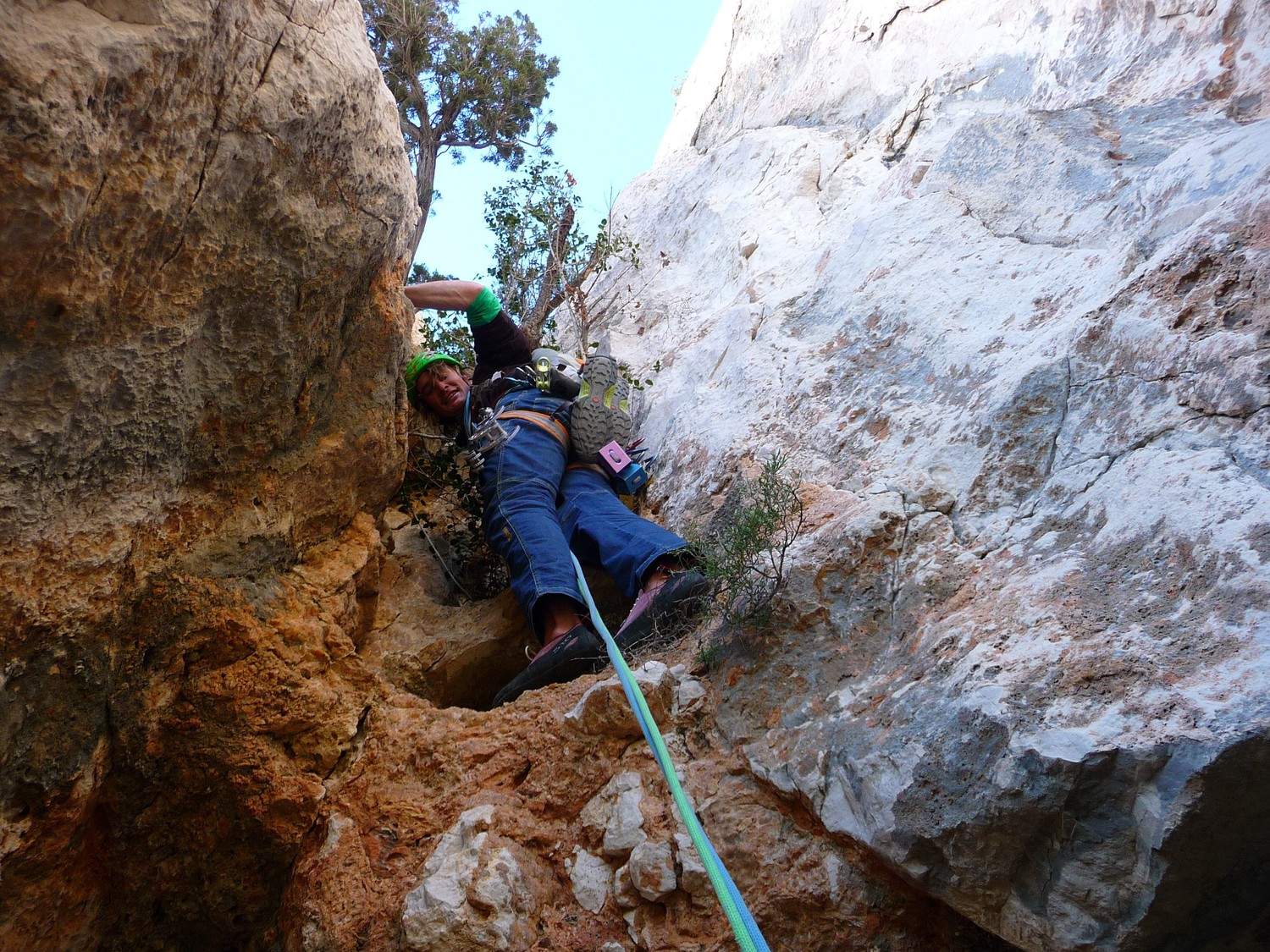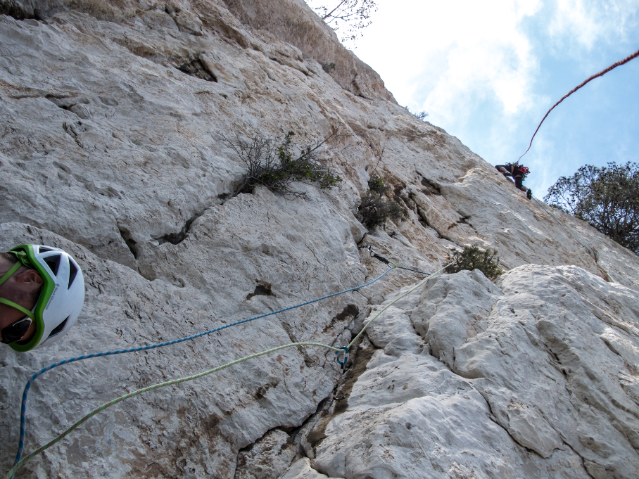 L4 : 5b, 25 mètres; Un pas dur pour rentrer dans une cheminée assez végétale, la remonter jusqu’à l’arête, relais à construire.
