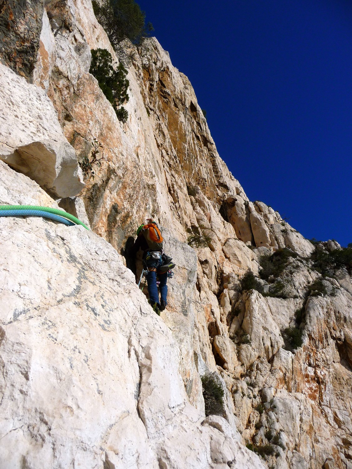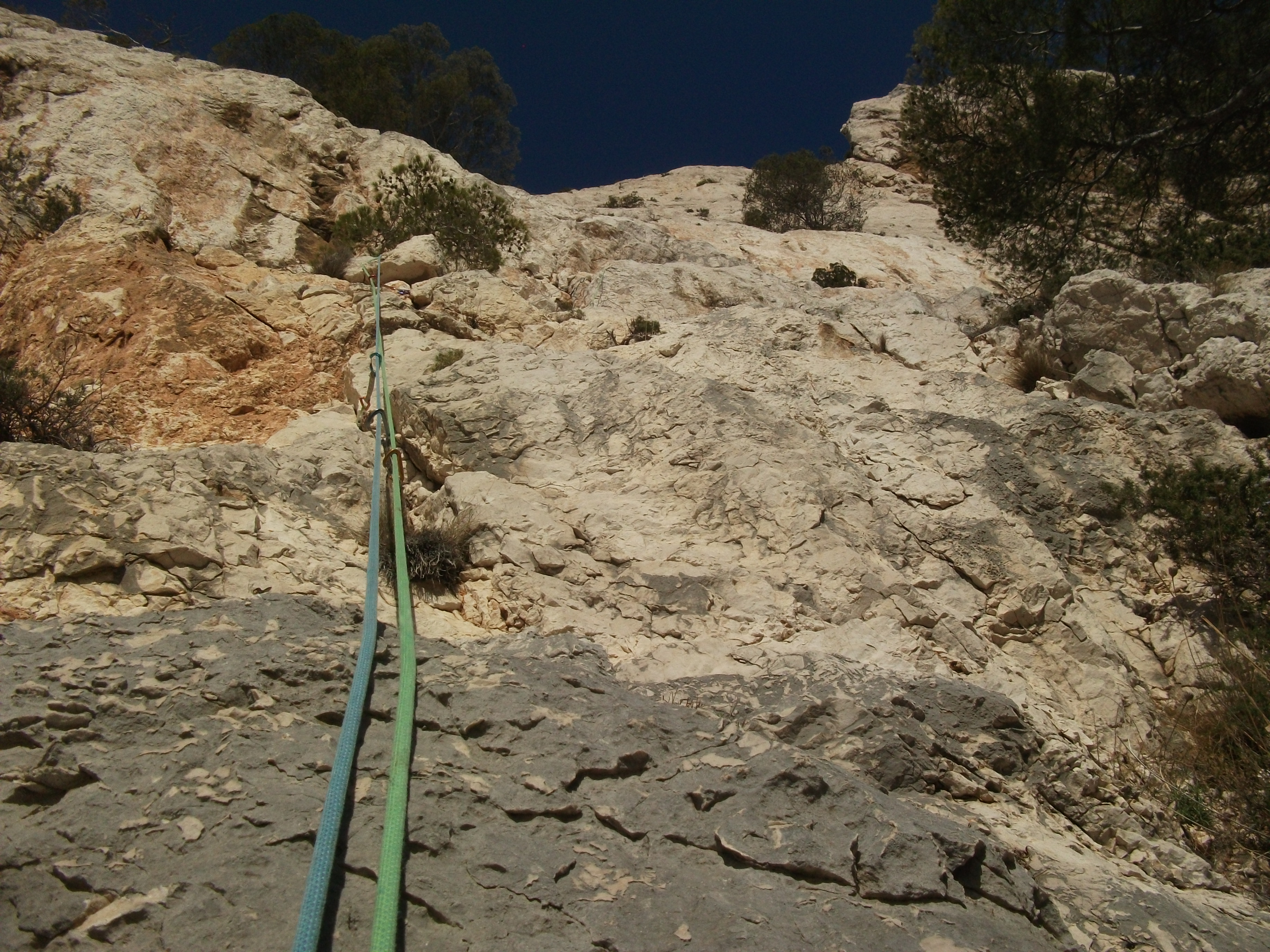 L3′ : 6a, 35 mètres; Remonter le dièdre immédiatement à droite du relais, se rétablir (deux lunules) puis remonter le dièdre superficiel par une fissure franche et athlétique, puis traverser sur une mini vire (plus facile, deux pitons et une lunule, ensemble assez engagé) jusqu’au pin sur la terrasse, (loin!) à gauche.