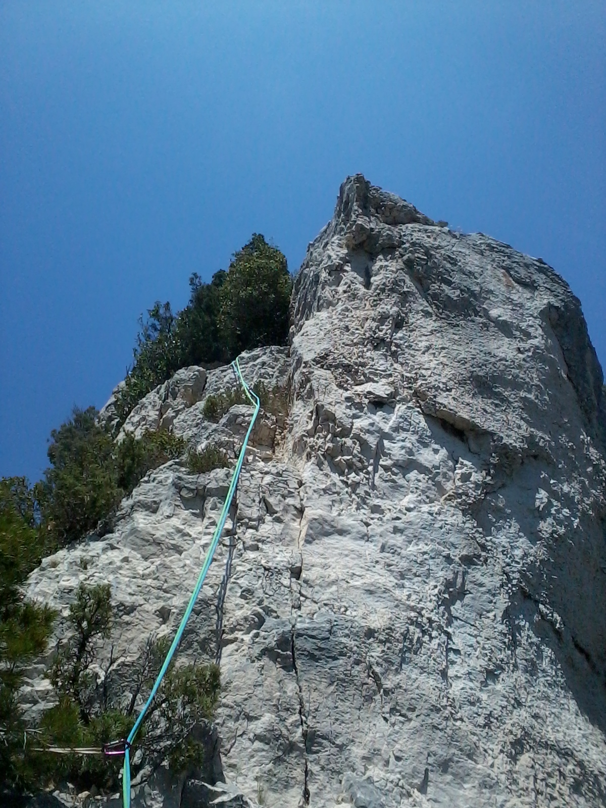 L2 : 3c ; remonter l’arête grâce a une fissure, franchir un mini jardin puis escalader l’aiguille, et la desescalader. Relais un peu plus loin sur un pin.