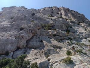 Descente : Suivre un sentier en direction du sommet (ouest), pour trouver une chaîne de rappel et redescendre ainsi.