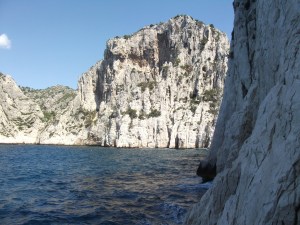 La falaise de l’Oule (ou du Belvédère) est l’une des plus remarquable des Calanques. L’ambiance, typique au dessus des flots, y est magique: coincée entre l’Eissadon et l’impressionnante muraille de Castelvieil, cette paroi possède un socle en beau rocher blanc, souvent dominé par des structures déversantes. Plus ou moins en forme de concave, le nom « oule » vient du provençal et signifie « trou ». Celui du creux de l’Oule, dû aux caprices maritimes. Des trous, il y en a. Des boyaux, des étroitures ou des passages traversant la falaise (trou du serpent). D’autres formes rocheuses, souvent arrondies, complètent cet ensemble harmonieux.