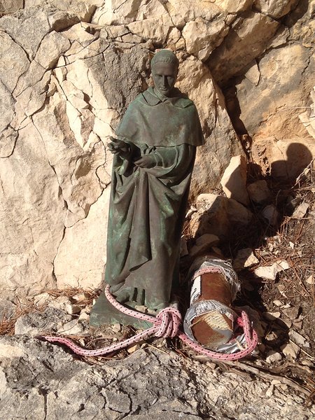 Saint Bernard de Menthon, ici représenté avec une statuette au premier relais. Placée bien avant l’équipement de la voie, elle témoigne d’une ancienne fréquentation