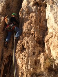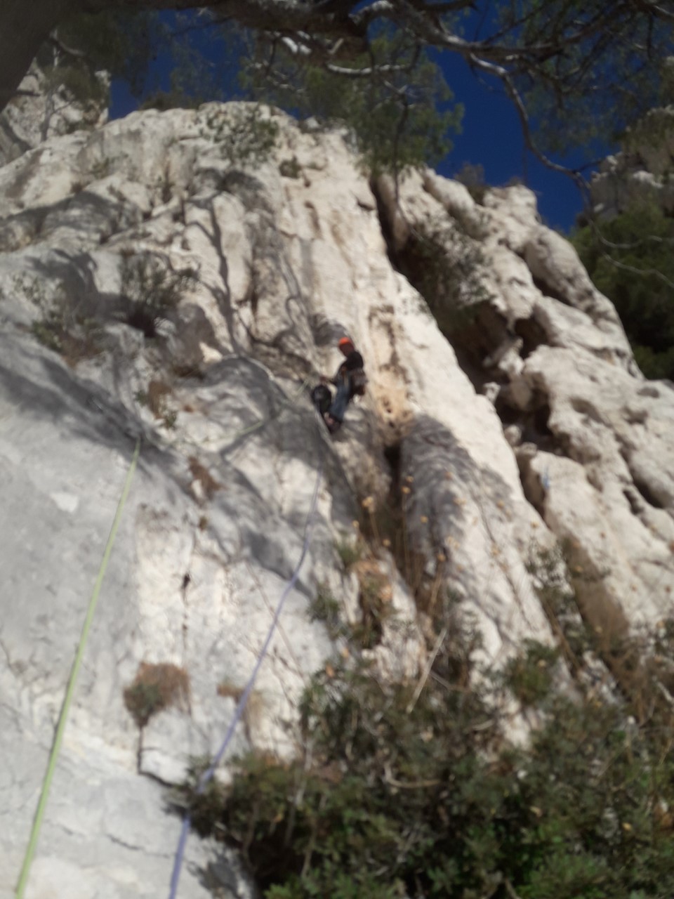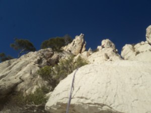 L3 : 6a+ (6b dans le topo… Dure à lire!), 15 mètres; (s’enchaine aisément avec L2) Premier point bien haut, puis escalade technique à droite des points.