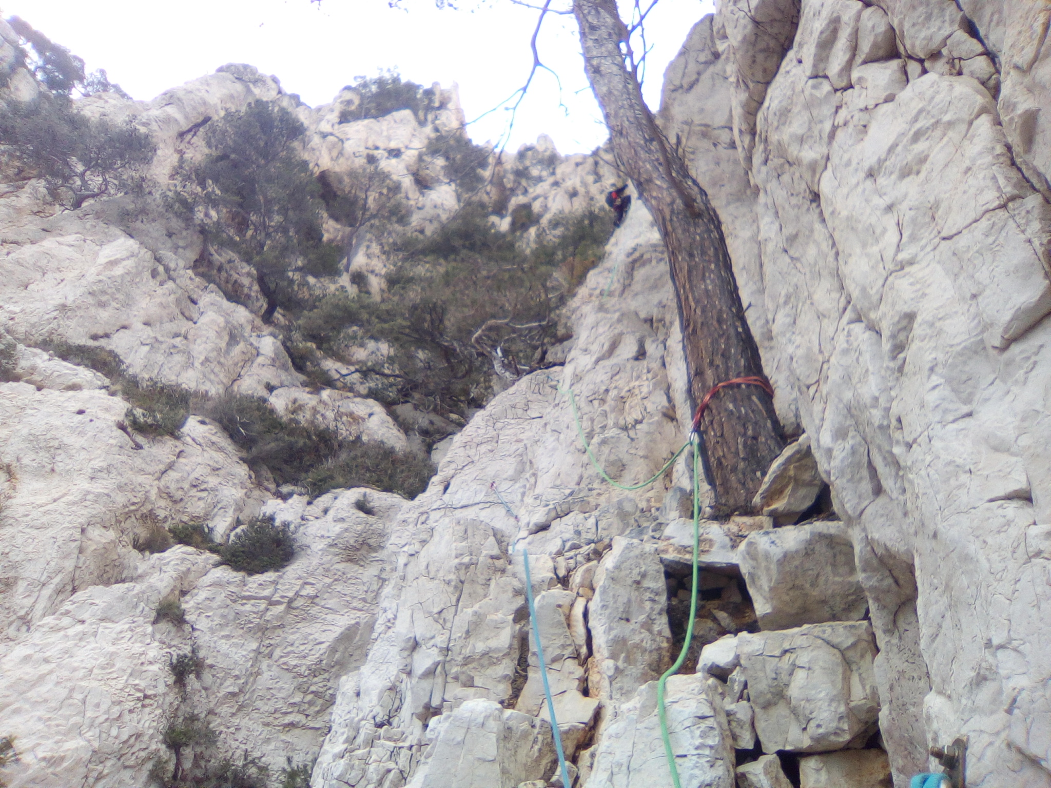 L’accès en rappel se fait depuis la brêche de Castelvieil, mais ainsi cela provoque un fort ravinement. Passer d’abord par les rappels de la traversée des écureuils peut sembler plus sage… Le dernier rappel se tire en direction du creux de l’Oule, et on effectue le relais zéro sur deux goujons (nombreux sont ceux qui en descendant tout droit doivent alors effectuer une courte traversée à gauche pour trouver ce relais).