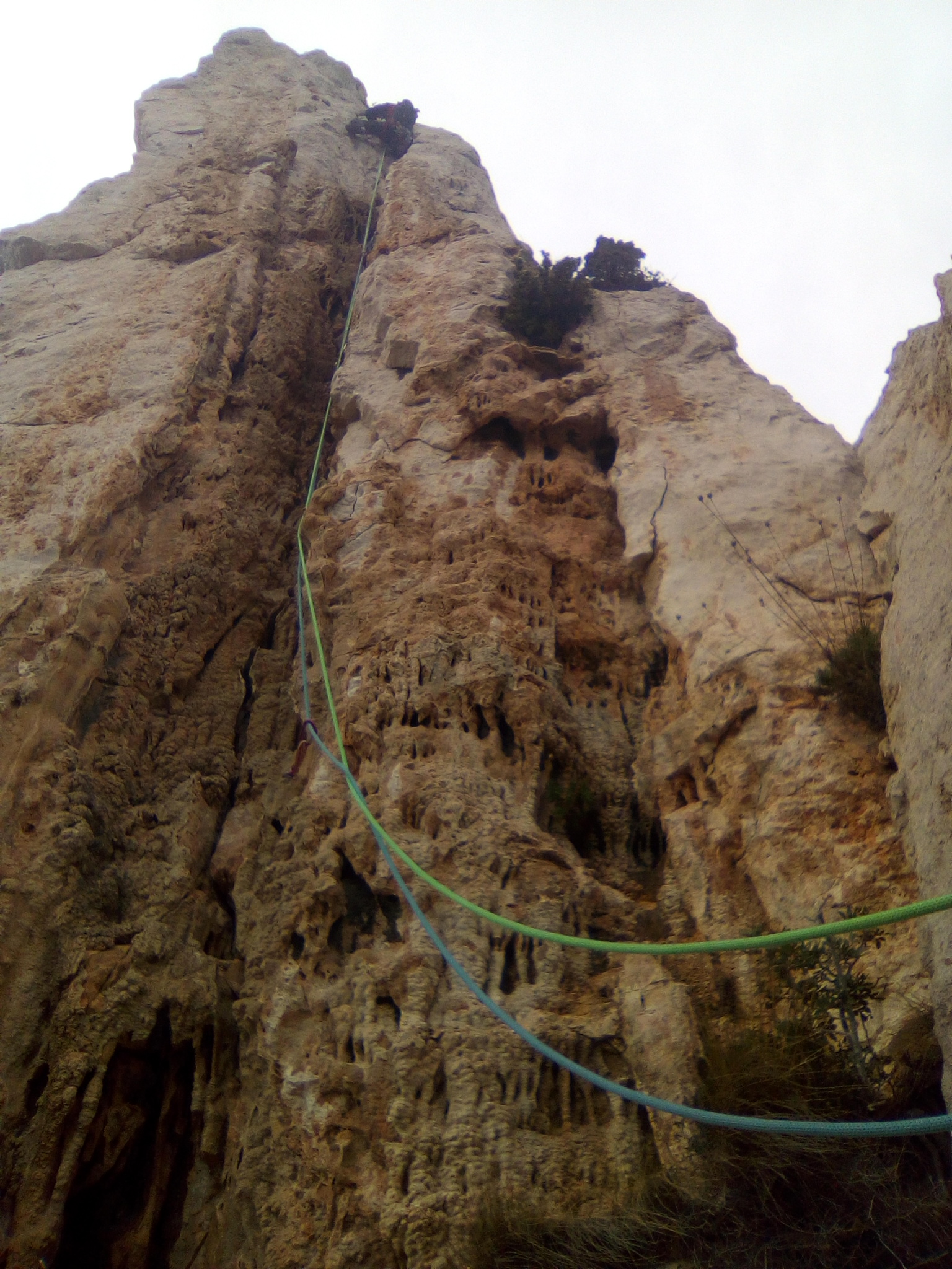 L1 : 6b (cotation bisounours); Droit au dessus avec des bonnes prises, puis crux dans la traversée magnifique. On sort par une fissure facile mais à protéger soi même (friends 1 et 2). On rattrape le relais de rappel.